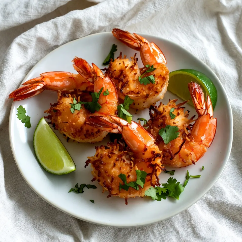 To make Air Fryer Coconut Shrimp, gather these simple items: - 1 lb large shrimp, peeled and deveined - 1 cup panko breadcrumbs - 1 cup shredded coconut (choose sweetened or unsweetened) - 1/2 cup all-purpose flour - 2 large eggs - 1 teaspoon garlic powder - 1 teaspoon paprika - Salt and freshly ground pepper to taste - Cooking spray or olive oil for coating You can swap ingredients for what you have on hand. Here are some ideas: - Use whole wheat flour instead of all-purpose flour for a healthier option. - Try using almond flour for a nutty flavor. - Any type of breadcrumbs works, but panko gives the best crunch. - If you want a different flavor, replace garlic powder with onion powder. - For a spicy kick, add cayenne pepper to the flour mix. Fresh shrimp can taste better, but frozen shrimp work great too. Here’s what to know: - Fresh shrimp should smell like the sea. If it smells off, don't use it. - Frozen shrimp are often frozen right after catch, keeping them fresh. - If using frozen, thaw them overnight in the fridge before cooking. - Make sure to dry shrimp well after thawing. This helps the coating stick. Using the right ingredients makes all the difference in your coconut shrimp. Each choice adds to the taste and texture. {{ingredient_image_2}} Preheat your air fryer to 400°F (200°C). This step is key for a crispy finish. A hot fryer cooks the shrimp evenly and keeps them crunchy. In a shallow dish, mix the flour, garlic powder, paprika, salt, and pepper. Whisk well to ensure everything blends. In another dish, crack the eggs and whisk until combined. For the final dish, combine the panko breadcrumbs and shredded coconut. Make sure they mix well for even coating. Take each shrimp and dip it first in the flour mixture. Shake off any extra flour. Then, dip the shrimp into the egg. This helps the coating stick. Next, transfer the shrimp into the panko-coconut mix. Press lightly to ensure the coating sticks well. Lightly spray your air fryer basket with cooking spray or brush it with olive oil. Arrange the shrimp in a single layer without crowding them. Cook for 6-8 minutes. Flip the shrimp halfway through for even browning. They should turn golden brown and be opaque when done. Enjoy your crispy coconut shrimp with your favorite dipping sauce! To get that perfect crunch, follow these steps. First, make sure you preheat your air fryer to 400°F (200°C). This is key for even cooking. Next, coat each shrimp well. Start with the flour mixture, then dip in egg, and finally, cover with the panko and coconut mix. Press the coating onto the shrimp. This helps it stick. Don't overcrowd the basket. Give each shrimp space to breathe. Flip them halfway through cooking to ensure even crispiness. Dipping sauces can really enhance your coconut shrimp. My favorites include sweet chili sauce and zesty mango salsa. They provide a nice contrast to the shrimp's crunch. You can also try a spicy aioli for a kick. A simple lime juice and honey blend works well too. These sauces add a burst of flavor that complements the shrimp perfectly. You can prep these shrimp ahead of time! Coat them and place them in a single layer on a baking sheet. Cover and chill for up to 24 hours. When ready, just pop them into the air fryer. For longer storage, freeze the coated shrimp on a baking sheet. Once frozen, transfer them to a zip-top bag. They can last up to three months. When you want some, air fry them straight from the freezer. No need to thaw! Pro Tips Freshness Matters: Always use fresh shrimp for the best flavor and texture. Look for shrimp that are firm and have a mild sea smell. Customize Your Coating: Feel free to experiment with different seasonings in the flour mixture or add spices to the panko-coconut blend for a unique twist. Keep It Light: Don't overcrowd the air fryer basket; cooking in batches will ensure each shrimp gets the perfect crispy texture. Dipping Sauce Delight: Pair your coconut shrimp with a variety of dipping sauces, such as sweet chili sauce or a tangy lime aioli, to elevate the dish. {{image_4}} To add some heat to your coconut shrimp, try a spicy twist. Use 1-2 teaspoons of cayenne pepper or chili powder in your flour mixture. This will give your shrimp a nice kick. You can also add some chopped jalapeños into the breadcrumb and coconut mix. This makes each bite exciting and full of flavor. If you want a veggie version, use firm vegetables like zucchini or eggplant. Slice them into thick strips. Follow the same coating process as the shrimp. They will cook well in the air fryer and get crispy. This is a great way to enjoy the flavors of coconut without seafood. For a fun meal, turn your coconut shrimp into tacos. After air frying, place the shrimp in warm corn tortillas. Add toppings like shredded cabbage, avocado slices, and a drizzle of lime juice. You can also serve them with salsa for extra flavor. These tacos are perfect for gatherings or a quick dinner. After you make your air fryer coconut shrimp, let them cool. Place them in an airtight container. Store the shrimp in the fridge for up to three days. Keep them away from strong-smelling foods to avoid any flavor transfer. If you want to enjoy them later, make sure to seal the container well. To reheat, use your air fryer again. Preheat it to 350°F (175°C). Place the shrimp in the basket in a single layer. Heat them for about five minutes. This method helps restore their crispiness. You can also use a conventional oven at the same temperature for about ten minutes. Just check to avoid overcooking. If you want to freeze the shrimp, do this before cooking them. After coating, place the shrimp on a baking sheet. Freeze them for about an hour until firm. Then, transfer them to a freezer-safe bag. They will last for up to three months in the freezer. When ready to eat, cook them straight from the freezer. Just add a few extra minutes to the cooking time. Coconut shrimp tastes great with many sauces. You can use sweet chili sau