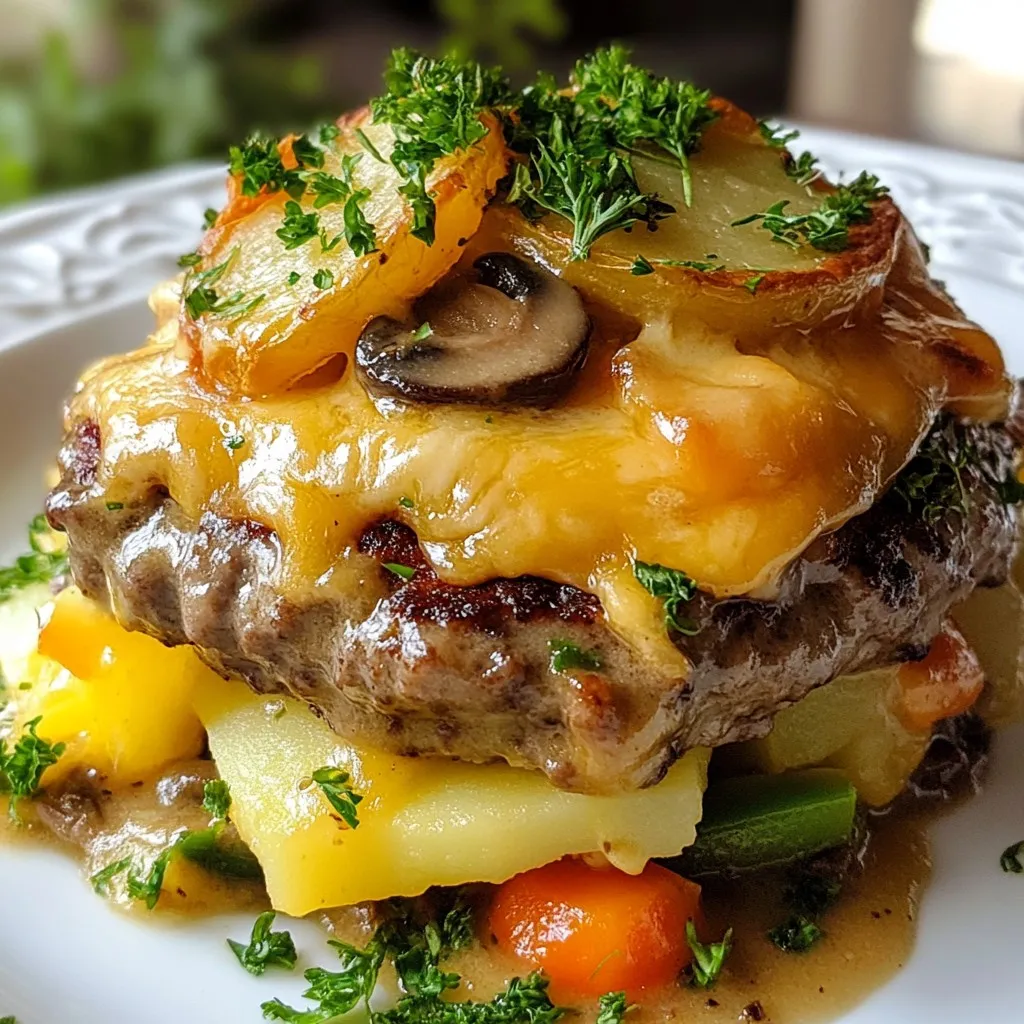 A comforting and hearty dish featuring hamburger patties baked with creamy soup, vegetables, and topped with cheesy potatoes.