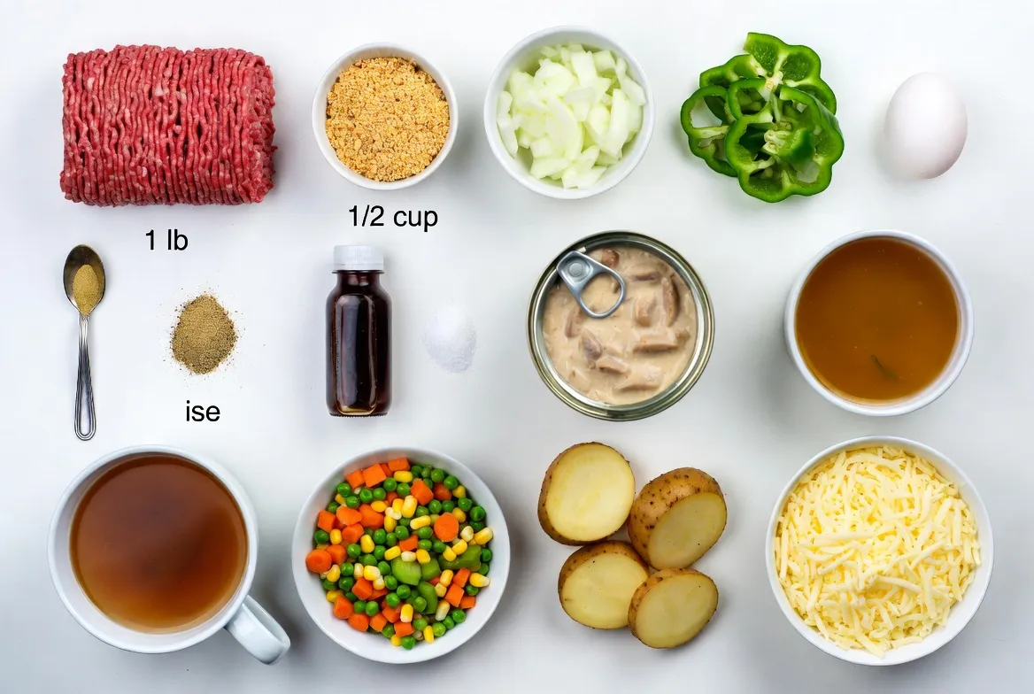 The main ingredients set the stage for this dish. Ground beef gives a hearty base, while the cream of mushroom soup adds creaminess. Frozen mixed vegetables bring color and nutrition, making each bite balanced.