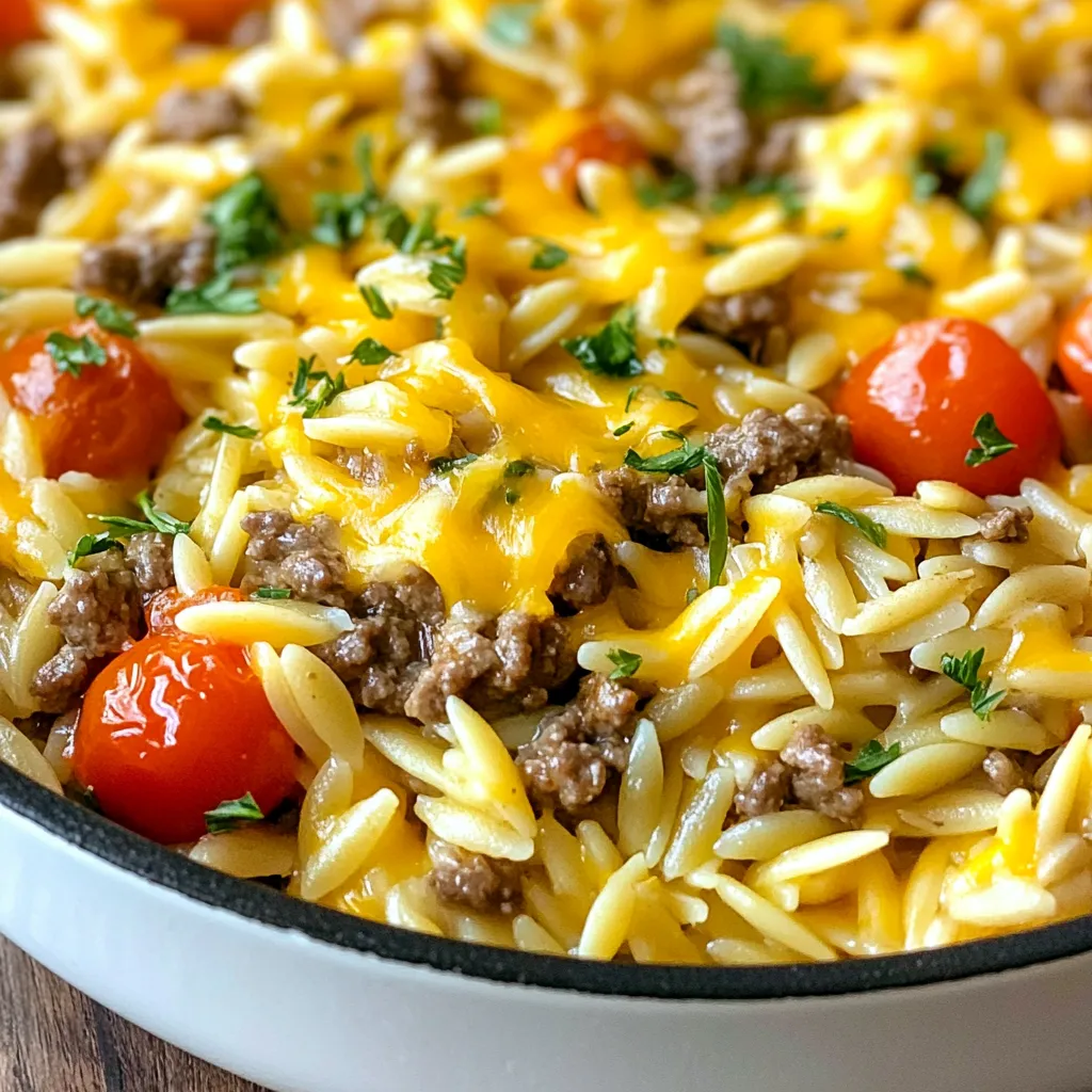 To make a tasty cheeseburger orzo skillet, gather these key ingredients: - 1 cup orzo pasta - 1 pound ground beef or ground turkey - 1 medium onion, finely diced - 2 cloves garlic, minced - 1 cup cherry tomatoes, halved - 1 cup beef broth (or vegetable broth for a lighter option) - 1 tablespoon ketchup - 1 tablespoon yellow mustard - 1 teaspoon Worcestershire sauce - 1 teaspoon smoked paprika - 1 cup shredded sharp cheddar cheese - Salt and black pepper to taste - Fresh parsley, chopped (for garnish) You can easily swap out some ingredients for this dish: - For a lighter meal, use ground turkey instead of ground beef. - If you want less salt, choose low-sodium beef broth. - You can use any small pasta if you don’t have orzo. - If you prefer a milder flavor, swap sharp cheddar for mild cheddar or mozzarella. Want to make it your own? Here are some great add-ins: - Sprinkle in some diced bell peppers for extra crunch. - Add spinach or kale for a healthy boost of greens. - For a spicy kick, toss in some chopped jalapeños. - Mix in a handful of frozen peas for sweetness and color. These options can help you customize your cheeseburger orzo skillet. Enjoy the cooking process! {{ingredient_image_2}} Start by heating a large skillet over medium heat. Add 1 pound of ground beef or ground turkey. Use a wooden spoon to break apart the meat as it cooks. Brown it for about 5-7 minutes until it is fully cooked. Drain any extra fat from the skillet to keep the dish light and healthy. Next, add 1 medium onion, finely diced, and 2 cloves of minced garlic into the skillet with the meat. Stir the mixture for 3-4 minutes. You want the onion to become soft and clear. This step adds a nice base of flavor. Now, it’s time to add the fun stuff! Toss in 1 cup of halved cherry tomatoes. Cook them for about 2 minutes until they soften a bit. Pour in 1 cup of orzo pasta and 1 cup of beef broth. Add 1 tablespoon of ketchup, 1 tablespoon of yellow mustard, 1 teaspoon of Worcestershire sauce, and 1 teaspoon of smoked paprika. Season everything with salt and black pepper. Stir well to mix it all up. Increase the heat to bring it to a gentle boil. Once boiling, lower the heat and cover the skillet. Let it simmer for 10-12 minutes until the orzo is tender and soaks up most of the broth. Stir occasionally to keep it from sticking. After the orzo cooks, take the skillet off the heat. Sprinkle 1 cup of shredded sharp cheddar cheese evenly over the top. Cover the skillet again for 1-2 minutes. This step helps the cheese melt perfectly. Once melted, your dish is ready! Garnish with fresh chopped parsley for a burst of color and serve it straight from the skillet or in bowls for a fun meal. Enjoy your Cheeseburger Orzo Skillet! To cook orzo perfectly, use enough liquid. The orzo needs to absorb the broth fully. I recommend stirring it every few minutes. This keeps it from sticking. Cook it until it's tender but still firm. This is called al dente. If you want a creamier texture, add a splash more broth at the end. To boost flavor, consider using fresh herbs. Basil or oregano can add great taste. You can also try adding crushed red pepper for heat. For a smoky twist, add more smoked paprika. If you like tang, squeeze some lemon juice on top. The acidity will brighten all the flavors. Serve your cheeseburger orzo straight from the skillet for a rustic look. You can also use bowls for a nice touch. Top each serving with extra cheese and parsley for color. A side salad or garlic bread pairs well with this dish. Don't forget to enjoy every bite! Pro Tips Use Quality Meat: Opt for lean ground beef or turkey for a healthier dish without sacrificing flavor. Cook Orzo Perfectly: Stir the orzo occasionally while it simmers to prevent sticking and ensure even cooking. Customize Your Toppings: Feel free to add toppings like pickles or crispy bacon for an extra burst of flavor. Make It Vegetarian: Substitute ground meat with lentils or mushrooms for a delicious vegetarian version of this dish. {{image_4}} You can easily make this dish meat-free. Replace the ground beef or turkey with a mix of sautéed mushrooms and lentils. This gives a hearty texture and loads of flavor. You can also use plant-based meat substitutes, like crumbles made from pea protein. For added protein, toss in some chickpeas or black beans. While ground beef is classic, you have options. Ground turkey or chicken works well. They provide leaner meat without losing taste. For a twist, try ground pork or lamb for a richer flavor. You can even use diced steak for a more gourmet touch. Just remember to adjust the cooking times as needed. Cheddar is great, but don't stop there. Try using Monterey Jack for a creamier texture. Pepper Jack adds a spicy kick, perfect for heat lovers. If you want a sharp flavor, go for Gruyère or a mix of mozzarella and Parmesan. Each cheese choice will give your orzo a unique taste. To store leftovers of your cheeseburger orzo skillet, let it cool first. Then, transfer it to an airtight container. Make sure to seal it well. You can keep it in the fridge for up to three days. This helps keep the flavors fresh and tasty. When you're ready to enjoy your leftovers, heat them on the stove. Place the orzo in a skillet with a splash of broth or water. Stir it over medium heat until heated through. You can also use a microwave. Place the orzo in a microwave-safe bowl. Cover it loosely and heat it for 1-2 minutes, stirring halfway through. If you want to save it for later, freezing is a great option. Allow the orzo to cool completely first. Then, portion it into freezer-safe bags or containers. Squeeze out as much air as you can before sealing. You can store it in the freezer for up to three months. When you're ready to eat, thaw it in the fridge overnight, then reheat as usual. Yes, you can make this dish ahead. Cook the Cheeseburger Orzo Skillet and let it cool. Store it in an airtight container in the fridge. It stays fresh for about three days.