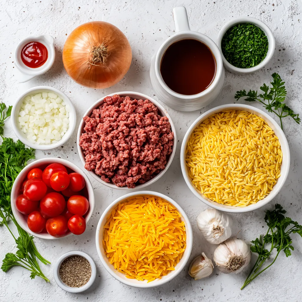 To make a tasty cheeseburger orzo skillet, gather these key ingredients: