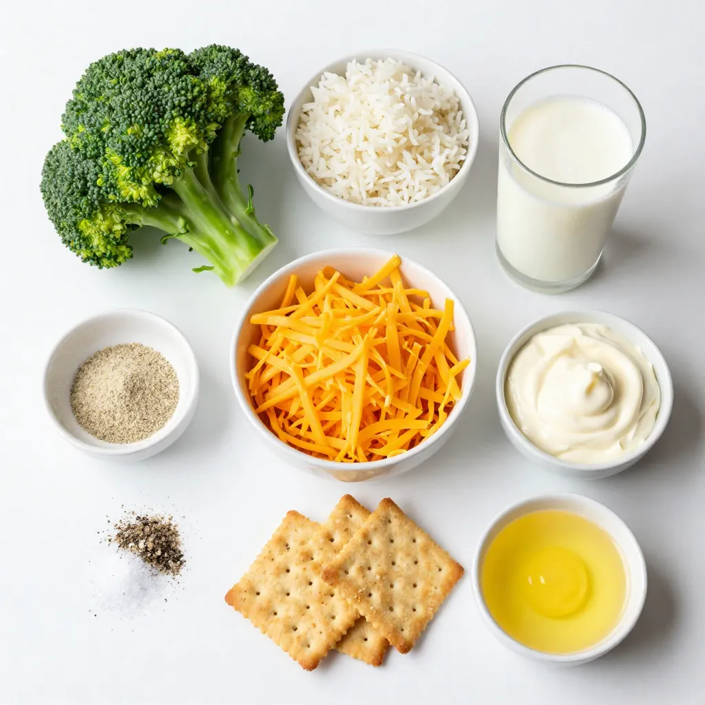 To make a tasty Cheesy Broccoli Cheddar Casserole, gather these items: