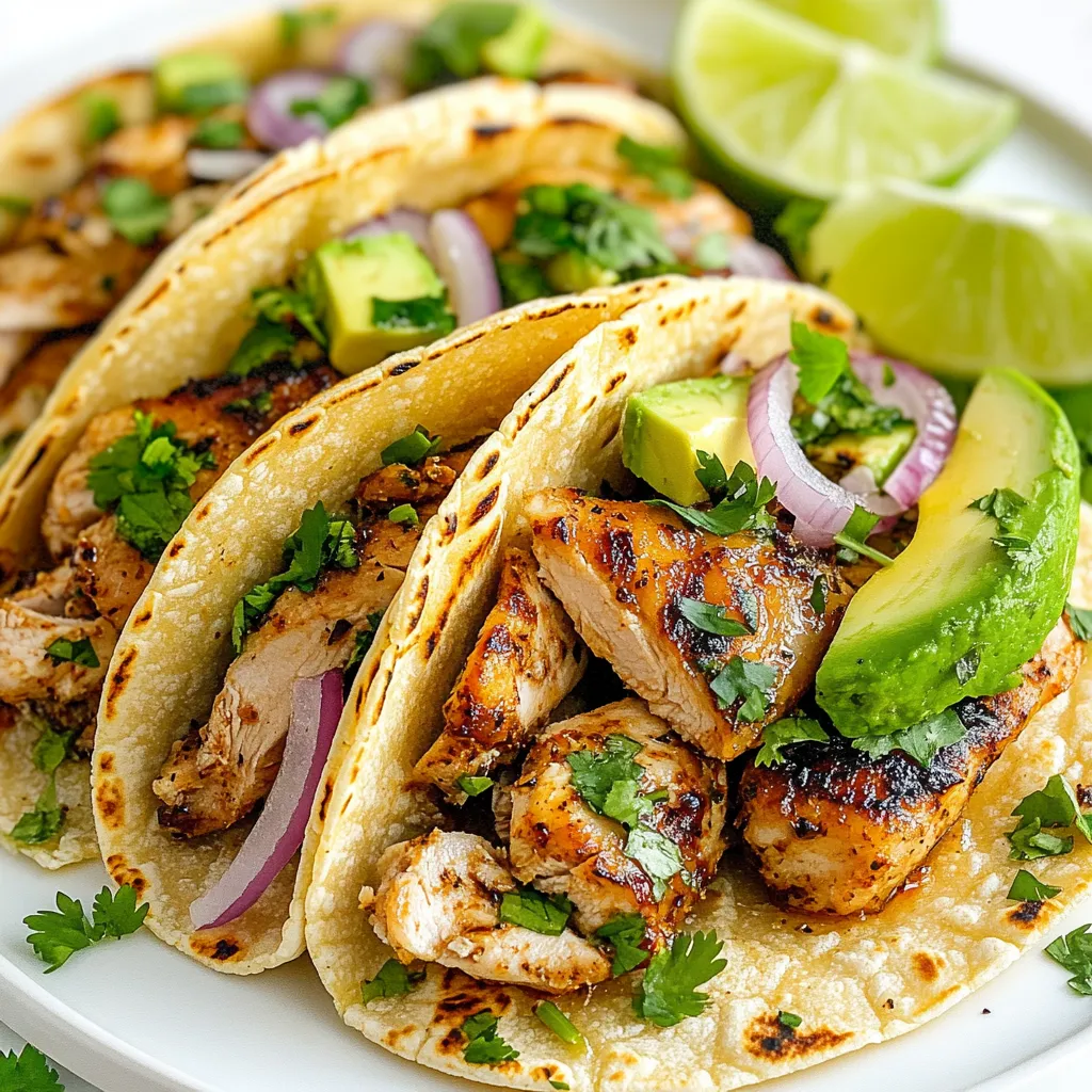 While the chicken rests, warm up 8 small corn tortillas in a dry pan over medium heat. Heat them for about 30 seconds on each side until they are soft. Now, slice the cooked chicken into bite-sized pieces. Lay some chicken on each warm tortilla. Top it with a generous amount of chopped cilantro, diced red onion, and sliced avocado. If you like heat, sprinkle on some diced jalapeños. Squeeze fresh lime juice over the tacos just before serving for a burst of flavor. Enjoy!