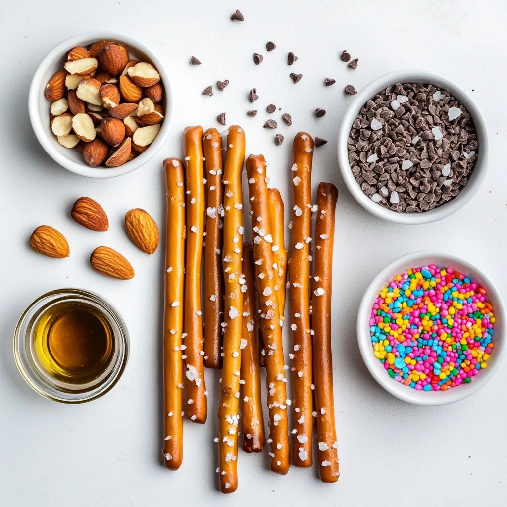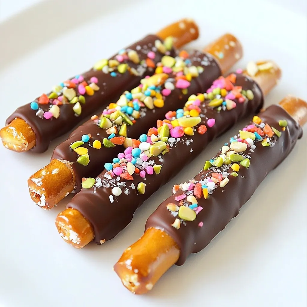 Gather these simple ingredients to create your chocolate dipped pretzel rods. The pretzel rods provide a crunchy base. The semi-sweet chocolate chips add a rich flavor. Coconut oil helps the chocolate melt smoothly. You can choose nuts based on your taste. Colorful sprinkles make your treats fun and festive. A sprinkle of sea salt adds a nice contrast. Each ingredient plays a role in making this snack delightful.