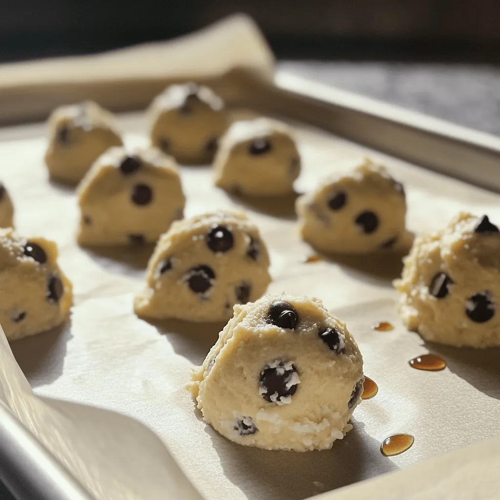 Once the dough is chilled, scoop out tablespoon-sized portions using a cookie scoop or spoon. Roll them into balls with your hands. If you prefer, you can flatten the dough slightly to create cookie shapes. Arrange the cookie dough bites on a tray lined with parchment paper for easy serving. If you want, drizzle a little extra maple syrup on top for added sweetness.