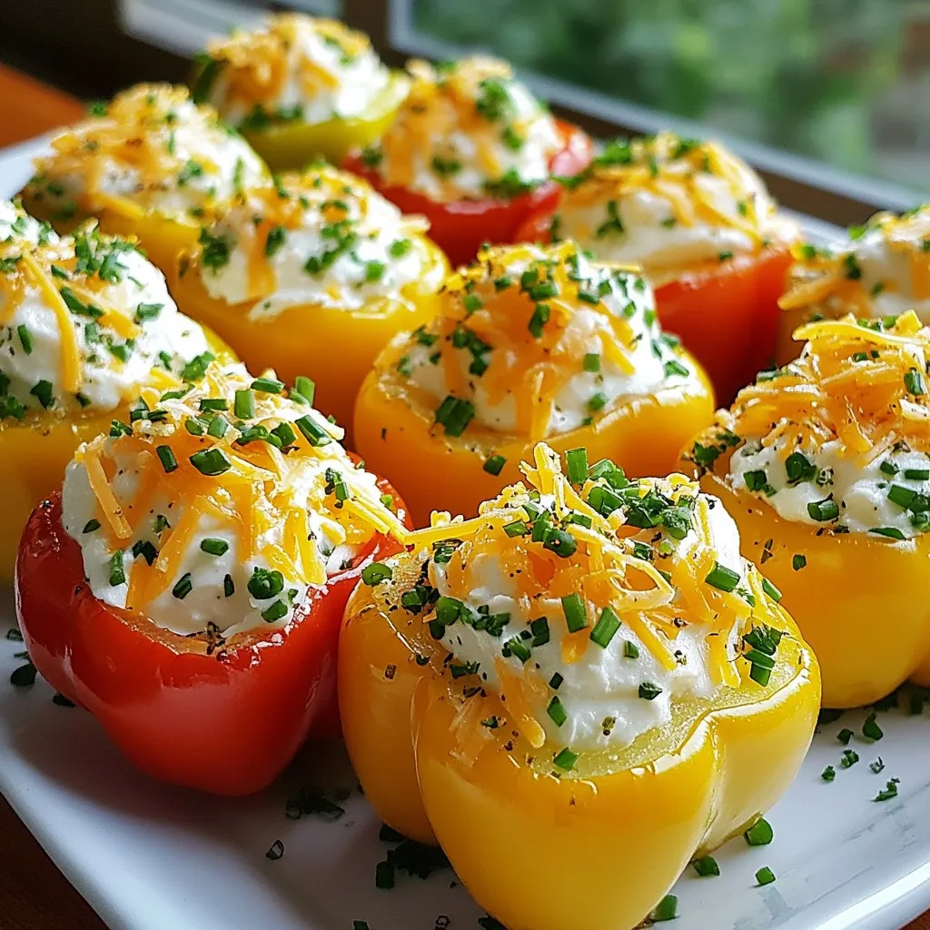 Delicious mini bell peppers filled with a creamy cheese mixture, perfect as an appetizer.