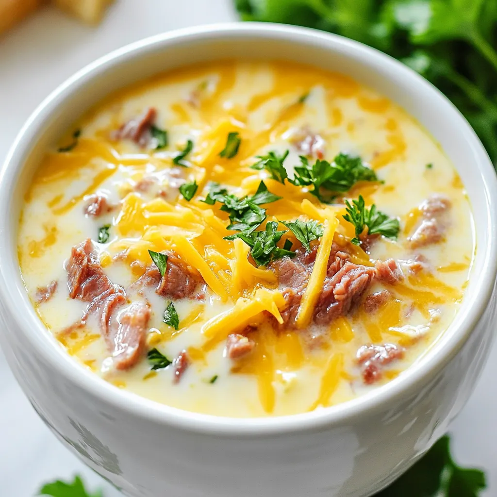 A rich and flavorful soup inspired by the classic Reuben sandwich, featuring corned beef, sauerkraut, and Swiss cheese in a creamy broth.
