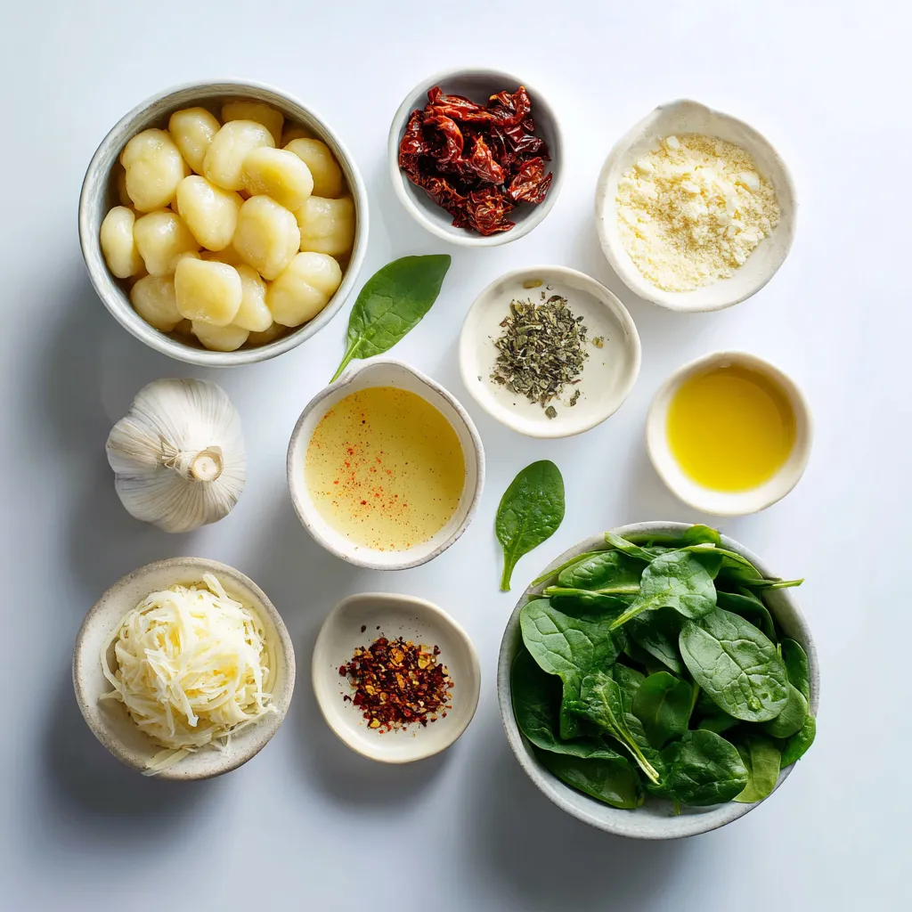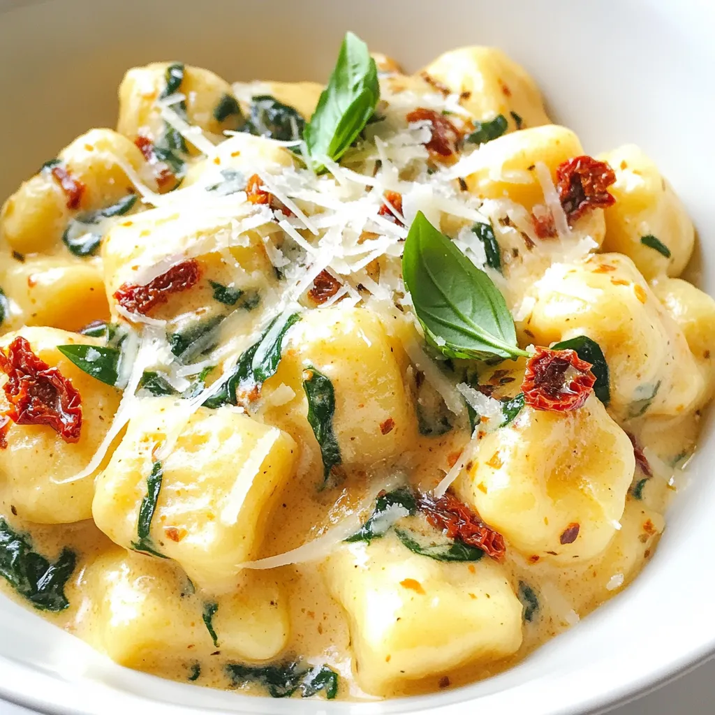 To create a tasty creamy sun-dried tomato gnocchi, gather these ingredients: - 1 package (16 oz) potato gnocchi - 1 cup sun-dried tomatoes, packed in oil, drained and chopped - 1 cup heavy cream - 1 cup vegetable broth - 1 teaspoon garlic, minced - 1 teaspoon onion powder - 1 teaspoon dried basil - ½ teaspoon red pepper flakes (optional) - 1 cup fresh spinach - ½ cup grated Parmesan cheese - Salt and black pepper to taste - Olive oil for sautéing - Fresh basil leaves for garnish I recommend using brands known for quality. For gnocchi, look for DeLallo or Giovanni Rana. For sun-dried tomatoes, choose Cento or Mezzetta. When it comes to cream, Organic Valley or Horizon is great. For Parmesan cheese, Grana Padano is a solid choice. Always check for freshness and quality when choosing your ingredients. Choosing quality ingredients makes a big difference. Here are some tips: - Gnocchi: Look for soft and pillowy gnocchi. They should feel light and not overly dense. - Sun-Dried Tomatoes: Choose those packed in oil; they add flavor and moisture. - Cream: Full-fat heavy cream gives the best taste and texture. - Fresh Spinach: Select bright green leaves with no wilting or browning. - Cheese: Always go for freshly grated cheese for a better melt and flavor. Using high-quality ingredients will enhance your dish's overall taste and make your creamy sun-dried tomato gnocchi a real delight. {{ingredient_image_2}} To make this dish, start by boiling water. Fill a large pot with water and add salt. Bring it to a strong boil. Next, add the potato gnocchi. Cook them as the package says. You'll know they are done when they float to the top. This usually takes just a few minutes. Once cooked, drain the gnocchi and place them in a bowl. Now, let's make the sauce. Take a large skillet and add a tablespoon of olive oil. Heat it over medium heat until it's warm. Add your minced garlic to the oil. Sauté it for about one minute. You want it to smell nice but not burn. After that, add your chopped sun-dried tomatoes. Sprinkle in the onion powder and dried basil. Stir everything together. Cook this mix for 2 to 3 minutes. This helps the flavors mix well. Next, pour in the heavy cream and vegetable broth. Stir to blend all the elements. Turn up the heat slightly and let it simmer gently. This should take around 5 minutes. You want it to thicken a little. Once the sauce is good, add the cooked gnocchi. Toss them in this creamy sauce. Now, add the fresh spinach and stir until it wilts, which takes about 2 minutes. To finish, mix in the grated Parmesan cheese until it melts. Season with salt, black pepper, and red pepper flakes if you want some spice. Cook for one more minute. Finally, serve hot. Top each plate with fresh basil leaves and more Parmesan if you like. Enjoy your creamy sun-dried tomato gnocchi! To create the perfect creamy sauce, start with high-quality heavy cream. This makes a big difference. Use fresh sun-dried tomatoes packed in oil for extra flavor. Always heat the oil before adding garlic. This helps release its best taste. Stir the sauce gently to keep it smooth. If it gets too thick, add a splash of vegetable broth. This keeps the sauce silky. One common mistake is cooking the garlic too long. It can burn and taste bitter. Also, avoid overcooking the gnocchi. They should float when ready. If you skip adding spinach, you lose a fresh taste. Lastly, don’t forget to season with salt and pepper. This enhances all the flavors in your dish. Serve your creamy sun-dried tomato gnocchi warm. Top each bowl with extra Parmesan cheese for richness. Add fresh basil leaves for color and flavor. Pair with a crisp salad or garlic bread for a complete meal. You can also serve it with a light white wine. This will enhance the flavors and make your meal special. Enjoy making this dish a go-to favorite! Pro Tips Use Fresh Ingredients: For the best flavor, opt for fresh spinach and high-quality sun-dried tomatoes packed in oil. Fresh ingredients enhance the overall taste of the dish. Adjust the Creaminess: If you prefer a lighter sauce, you can substitute some of the heavy cream with more vegetable broth. This will still keep the dish creamy but with fewer calories. Customize the Spice Level: The red pepper flakes are optional, so feel free to adjust the amount to suit your taste. You can also add fresh chili or omit them entirely for a milder flavor. Garnish for Presentation: Don't skip the fresh basil garnish! It adds a beautiful color contrast and a fragrant aroma that elevates the dish visually and flavor-wise. {{image_4}} For a vegetarian twist, use a mix of veggies. You can add mushrooms or bell peppers. These will add flavor and texture. Swap the vegetable broth with a homemade veggie stock for more depth. You can also use cashew cream instead of heavy cream for a lighter feel. If you need gluten-free options, try gluten-free gnocchi. Many brands offer this now. Ensure other ingredients are gluten-free too. For the sauce, use a gluten-free flour blend to thicken if needed. Always check labels to avoid hidden gluten. To spice things up, include more red pepper flakes. You can also add diced jalapeños or crushed chili peppers for heat. A splash of hot sauce can enhance the flavor too. Consider adding fresh herbs like oregano or thyme for extra flavor. Each of these variations makes this dish unique and fun. After enjoying your creamy sun-dried tomato gnocchi, store any leftovers in an airtight container. This helps keep the dish fresh. Make sure the dish cools first. You can store gnocchi in the fridge for up to three days. If you notice the sauce thickening, don't worry. It will loosen when you reheat it. To reheat, you can use the microwave or stovetop. If using the microwave, place the gnocchi in a bowl and cover it. Heat for about 1-2 minutes, stirring halfway. For the stovetop, add the gnocchi to a skillet with a splash of broth or cream. Heat over medium until warmed through. Stir often to avoid stick
