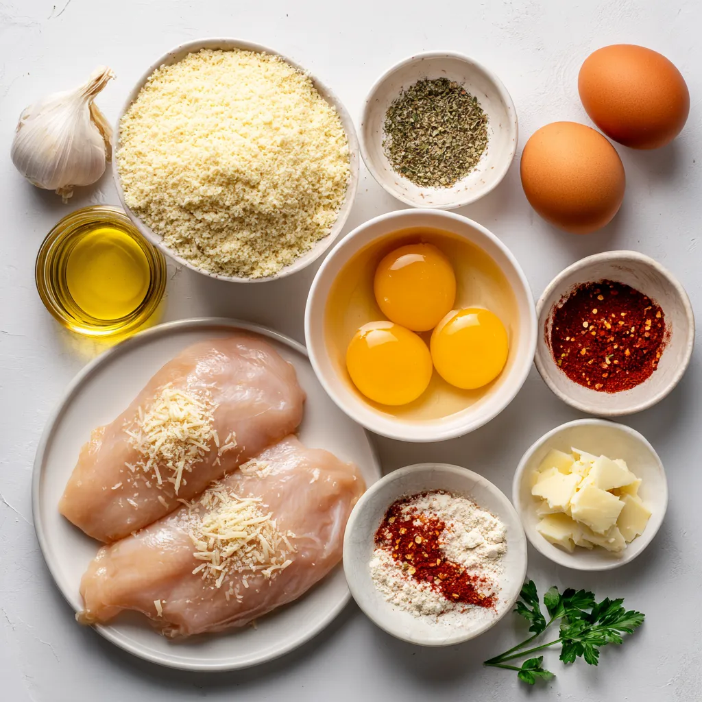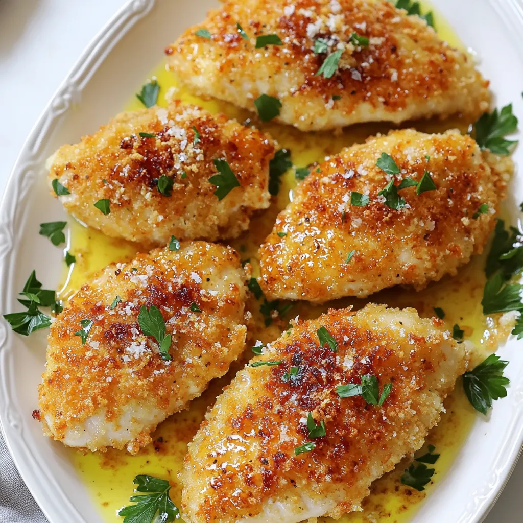 - 4 boneless, skinless chicken breasts - 1 cup panko breadcrumbs - 1 cup grated Parmesan cheese - 2 teaspoons garlic powder - 1 teaspoon paprika - 1 teaspoon dried Italian herbs (oregano, basil, thyme blend) - Salt and pepper to taste - 2 large eggs, beaten - ¼ cup all-purpose flour - ½ cup olive oil (for frying) To make the chicken crispy and flavorful, you need panko breadcrumbs and Parmesan cheese. The garlic powder and herbs add depth. - 6 cloves garlic, minced - 1 tablespoon unsalted butter - 1 teaspoon crushed red pepper flakes (optional, for heat) - ½ cup chicken broth - 2 tablespoons fresh parsley, chopped (for garnish) The garlic sauce is rich and savory. Fresh garlic gives it a strong flavor. The butter adds richness, while the chicken broth adds depth. - Large skillet - Baking sheet - Parchment paper - Three shallow bowls for dredging - Small saucepan Using the right tools helps make the cooking process smooth. A large skillet ensures even cooking, while parchment paper makes cleanup easy. {{ingredient_image_2}} Start by preheating your oven to 400°F (200°C). This helps the chicken cook evenly. Line a baking sheet with parchment paper for easy cleanup. In a shallow bowl, mix the panko breadcrumbs, grated Parmesan cheese, garlic powder, paprika, dried Italian herbs, salt, and pepper. Stir well to blend all the flavors. Next, set up your dredging station. You need three shallow bowls: one for the beaten eggs, one for the flour, and one for the breadcrumb mix. Take a chicken breast, dip it in the flour first. Shake off any extra flour. Then, dip it into the beaten eggs, letting any excess drip off. Finally, coat it in the panko-Parmesan mix. Press down gently to make sure it sticks well. Repeat this for all the chicken breasts. In a large skillet, heat the olive oil over medium heat. You want the oil hot, but not smoking. Carefully place your coated chicken breasts in the hot oil. Cook each piece for about 3-4 minutes on one side. Flip and cook for another 3-4 minutes, until they turn golden brown. If your skillet is small, cook the chicken in batches. This helps them crisp up nicely. Once browned, transfer the chicken to your prepared baking sheet. Bake the chicken in the oven for 15-20 minutes. Use a meat thermometer to check the inside. It should reach 165°F (75°C) for safe eating. While the chicken bakes, let’s make the garlic sauce. In a small saucepan, melt the unsalted butter over medium heat. Add the minced garlic and sauté for 1-2 minutes. Watch closely so it doesn’t burn. When the garlic smells good and looks golden, pour in the chicken broth. Let it simmer gently for 3-5 minutes. If you like it spicy, stir in crushed red pepper flakes now. Once the chicken is done baking, drizzle the garlic sauce over the top. This adds a rich flavor and makes the dish shine. Finish with fresh parsley for a pop of color. Enjoy your Crispy Parmesan Chicken with Garlic Sauce! To get that perfect crispy texture, follow these steps: - Use panko breadcrumbs. They are lighter and crispier than regular breadcrumbs. - Make sure to press the breadcrumb mixture firmly onto the chicken. This helps it stick better. - Fry in hot oil. Heat the olive oil until it shimmers before adding the chicken. - Avoid overcrowding the skillet. This keeps the oil hot and helps the chicken fry evenly. Cooking at the right temperatures is key for crispy chicken: - Start by frying the chicken on medium heat. This browns the outside without burning it. - After frying, bake the chicken at 400°F (200°C). This ensures it cooks through while keeping it crispy. - Always check the oil temperature. It should be around 350°F (175°C) for frying. Checking if your chicken is done is easy and important: - Use a meat thermometer. The internal temperature should reach 165°F (75°C). - If you don't have a thermometer, cut into the thickest part of the chicken. The juices should run clear, not pink. - Let the chicken rest for a few minutes after baking. This keeps it juicy and flavorful. Pro Tips Use Fresh Ingredients: Always opt for fresh garlic and high-quality chicken for the best flavor and texture in your dish. Double-Dip for Extra Crunch: For an even crispier crust, consider double-dipping the chicken in the egg and breadcrumb mixture. Let It Rest: After frying, let the chicken rest for a few minutes before serving to allow the juices to redistribute. Adjust Spice Level: Modify the amount of crushed red pepper flakes in the garlic sauce based on your preference for heat. {{image_4}} You can switch up the breading for your chicken. Instead of panko, try crushed cornflakes for a crunchier bite. You could also use regular breadcrumbs if that’s what you have on hand. For a nutty flavor, coat the chicken with finely ground almonds or walnuts. Each option gives the chicken a unique taste and texture. You can make the garlic sauce even more special. Add lemon juice for brightness and a fresh taste. For a richer flavor, try adding cream to the sauce. You can also mix in fresh herbs like thyme or rosemary for extra aroma. If you love spicy food, add more red pepper flakes or a dash of hot sauce. Don’t worry if you don’t have chicken breasts. You can use chicken thighs, which stay juicy and full of flavor. If you want a lighter option, try using turkey cutlets. For a vegetarian twist, use thick slices of eggplant or zucchini. Just adjust the cooking time as needed for different proteins or veggies. To keep your crispy Parmesan chicken fresh, let it cool down first. Place the chicken in an airtight container. Store it in the fridge for up to three days. If you want to enjoy it later, keep the garlic sauce separate. This helps to keep the chicken crispy. When you're ready to eat the leftovers, preheat your oven to 350°F (175°C). Place the chicken on a baking sheet lined with foil. Heat it for about 10-15 minutes. This method keeps the chicken crispy. You can also reheat the garlic sauce in a small pot over low hea