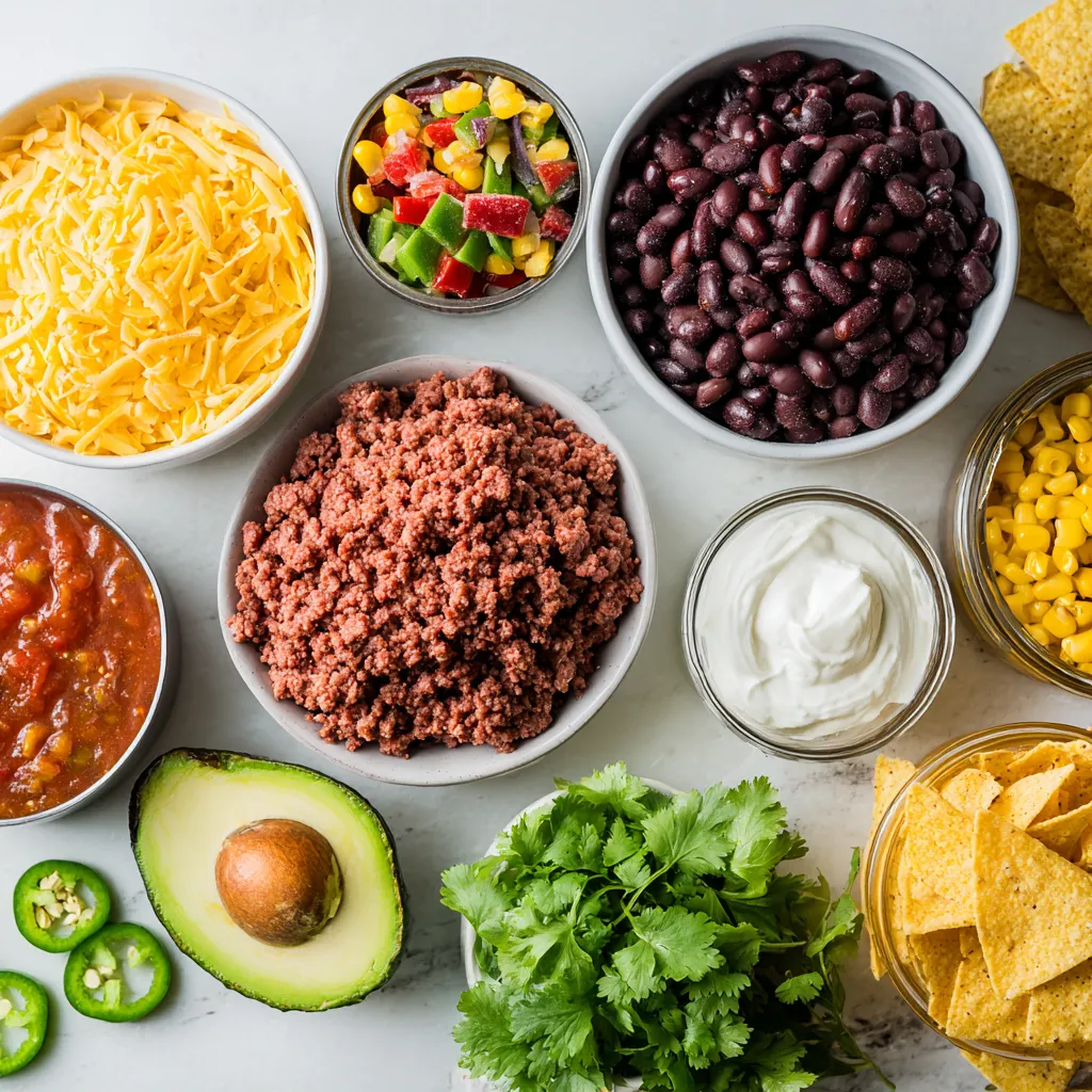 Each ingredient adds its own flavor and texture. Ground beef or turkey provides protein and heartiness. The black beans and kidney beans add fiber and richness. Corn brings sweetness, and diced tomatoes add moisture. Taco seasoning gives it that classic taco taste.