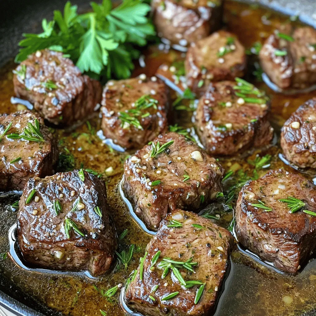 - 1 pound beef sirloin, cut into bite-sized cubes - 4 tablespoons unsalted butter - 4 cloves garlic, minced - 1 tablespoon fresh rosemary, finely chopped - 1 tablespoon fresh thyme, finely chopped - Salt and black pepper, to taste - 1 tablespoon olive oil - Fresh parsley, chopped, for garnish - Red pepper flakes for added heat - Lemon juice for brightness - Parmesan cheese for extra flavor To make Garlic Butter Beef Bites, you need a few key ingredients. The star of the dish is the beef sirloin. It gives a nice, tender bite. You’ll also use butter, garlic, and fresh herbs. These ingredients create a rich and savory flavor. I recommend using unsalted butter. It allows you to control the saltiness. Fresh herbs like rosemary and thyme brighten the dish. Don’t skip the garlic; it adds a wonderful aroma. For a spicy kick, add red pepper flakes. A squeeze of lemon juice can brighten the flavor. You may also sprinkle some parmesan cheese on top for an extra layer of taste. Gather these ingredients, and you’ll be ready to create a delicious meal in no time! 1. Heat a large skillet over medium-high heat. 2. Add one tablespoon of olive oil to the hot skillet. 3. While the oil heats, season 1 pound of beef sirloin cubes with salt and black pepper. 4. Once the oil is hot, place the beef in a single layer. 5. Sear the beef for 2-3 minutes until it gets a nice brown crust. 6. Flip the beef with tongs to brown the other side for another 2-3 minutes. 1. Lower the heat to medium-low. Move the beef to one side of the skillet. 2. In the clear space, add 4 tablespoons of unsalted butter, 4 minced garlic cloves, 1 tablespoon of chopped rosemary, and 1 tablespoon of chopped thyme. 3. Let the butter melt slowly. Stir to mix the garlic and herbs, cooking for 1-2 minutes. 4. Toss the beef bites in the garlic butter sauce, coating each piece well. 5. Cook for an extra 1-2 minutes until the beef is done to your liking. 1. Transfer the beef bites to a serving platter. 2. Garnish with freshly chopped parsley for a pop of color. - Avoid overcrowding the pan. If you add too many beef cubes, they won’t brown well. Each piece needs space to sear. - Use high heat for a good crust. A hot skillet helps lock in the juices. - Experiment with additional herbs. Try adding sage or oregano for a new twist. Fresh herbs can brighten the dish. - Consider marinating the beef beforehand. A simple marinade can add depth and help tenderize the meat. - Try different cuts of beef. Cuts like ribeye or tenderloin work great too. Each cut has a unique flavor and texture. - Make it spicy with additional seasonings. Add red pepper flakes or hot sauce for a kick. Adjust these to match your taste. {{image_4}} You can change how you cook your beef bites for more fun. Grilling is one tasty option. Preheat your grill to medium-high heat. Thread the seasoned beef cubes onto skewers. Grill for about 2-3 minutes on each side. This gives a great smoky flavor that many love. Using a slow cooker is another method. This makes the beef very tender. Simply add the beef, garlic, butter, and herbs to the slow cooker. Cook on low for 6-8 hours. The flavors mix well, and the beef becomes very soft. Want to mix it up? You can add sauces to your beef bites. For a sweet and tangy taste, try teriyaki or BBQ sauce. Just toss the cooked beef bites in the sauce before serving. This adds a nice glaze and extra flavor. Another fun idea is a creamy garlic sauce. You can make this by adding heavy cream to your garlic butter mix. Stir it in after the garlic cooks. This gives a rich and smooth sauce that pairs well with the beef. If you want a meat-free meal, you can switch beef for tofu or mushrooms. Tofu absorbs flavors well. Cut it into cubes and follow the same steps as beef. For mushrooms, use large portobello or shiitake. They add a nice, earthy taste. Another tasty option is to create garlic butter veggie bites. Use a mix of your favorite veggies like bell peppers, zucchini, and asparagus. Sauté them in garlic butter just like the beef. This gives you a delightful, healthy dish that everyone will enjoy. To store leftover Garlic Butter Beef Bites, let them cool first. Place the beef bites in an airtight container. This keeps them fresh and prevents odors from mixing. I recommend using glass or plastic containers with tight lids. They work well for storage and reheating. The best way to reheat beef bites is on the stove. Use a skillet over medium heat. Add a little olive oil or butter to keep them moist. Stir gently to ensure they heat evenly. You can also use a microwave, but be careful to not overcook them. This keeps the flavor and texture just right. You can freeze Garlic Butter Beef Bites for later meals. Let them cool completely before freezing. Place them in freezer-safe bags or containers. Remove as much air as possible to prevent freezer burn. When you’re ready to eat, thaw them in the fridge overnight. Then, reheat them gently in a skillet for best results. To make Garlic Butter Beef Bites spicy, add red pepper flakes. You can also use a spicy seasoning blend. Adjust the amount based on your heat preference. For a zesty twist, add a splash of hot sauce when tossing the beef. This will give your dish a nice kick. Yes, you can use frozen beef. However, make sure to thaw it fully first. This helps the beef cook evenly. If you cook frozen beef, the outside may burn before the inside cooks. Thawing ensures you get that nice brown crust you want. Garlic Butter Beef Bites go well with many sides. A simple green salad adds freshness. You can also serve it with mashed potatoes for comfort. Roasted veggies make a colorful plate. Rice or pasta can soak up the tasty garlic butter too. To check if the beef is cooked perfectly, use a meat thermometer. For medium-rare, aim for 130-135°F. If you don’t have a thermometer, cut a piece in half. The center should still have some pink but not be raw. You can prep some parts ahead of time. Cut the beef and mince the