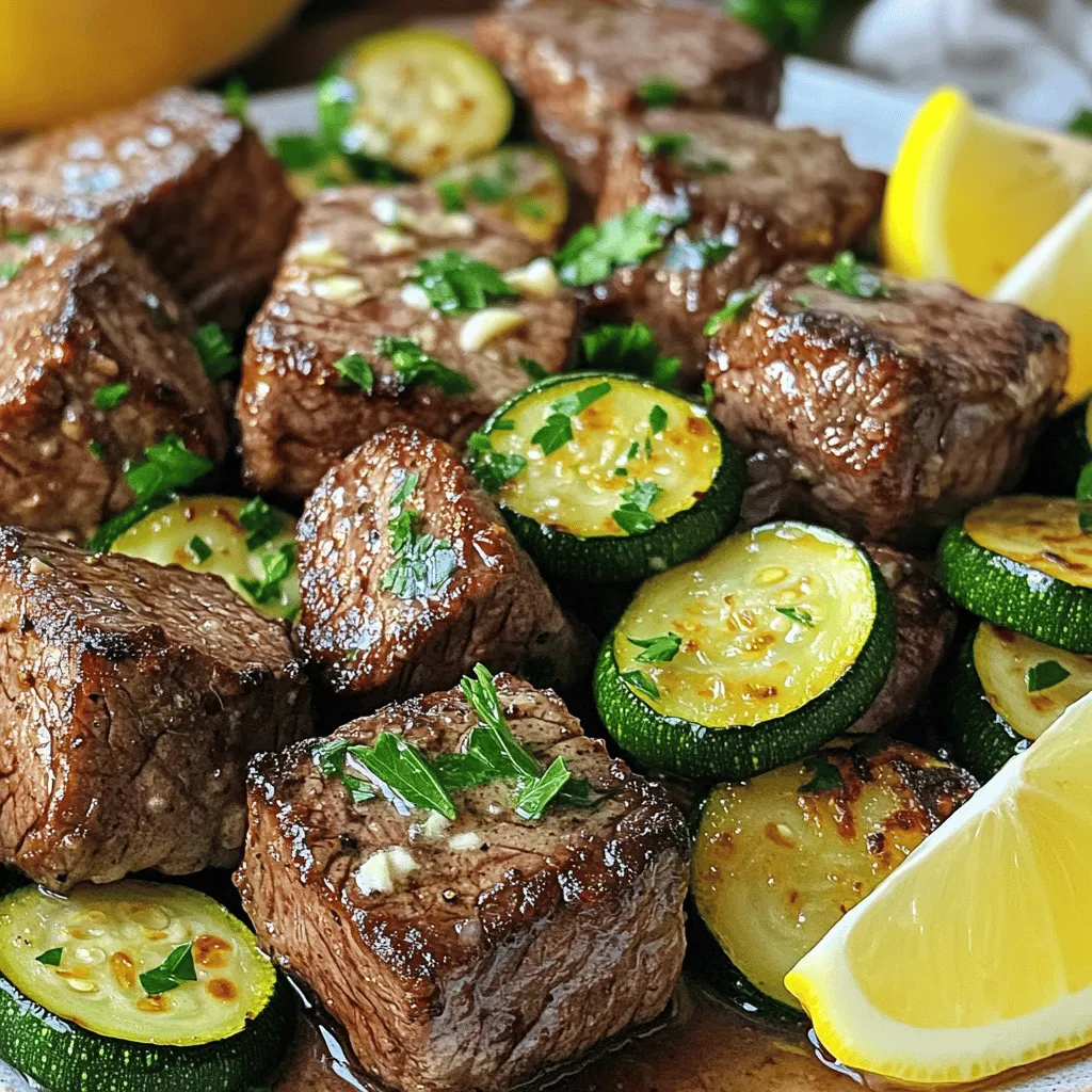 Carefully transfer the garlic butter steak bites and zucchini to a serving platter. Garnish with freshly chopped parsley for a pop of color. Serve with lemon wedges for a zesty touch. This dish not only looks great but tastes amazing too!