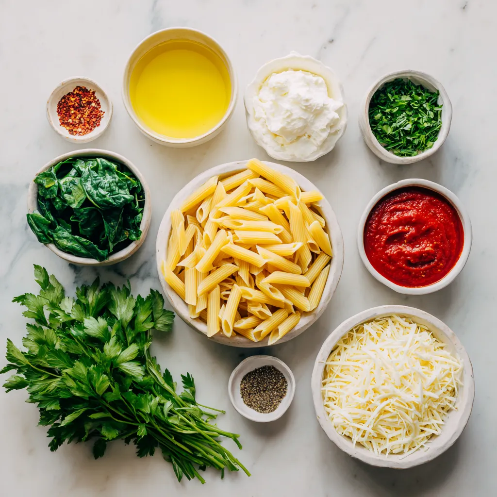 A delicious baked pasta dish featuring penne, ricotta, spinach, and a blend of cheeses, topped with a golden crust.