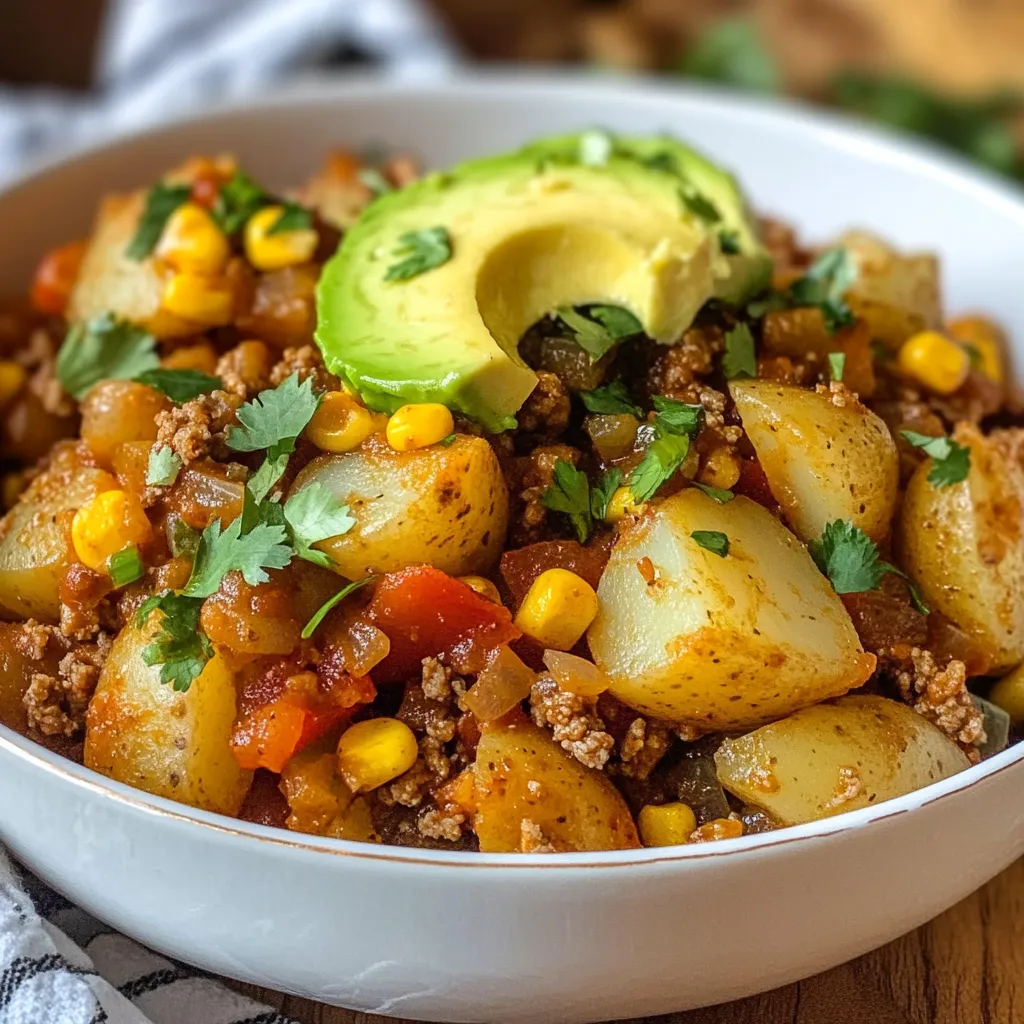 A hearty and flavorful skillet dish featuring ground turkey, diced potatoes, and vibrant vegetables, perfect for a quick weeknight meal.