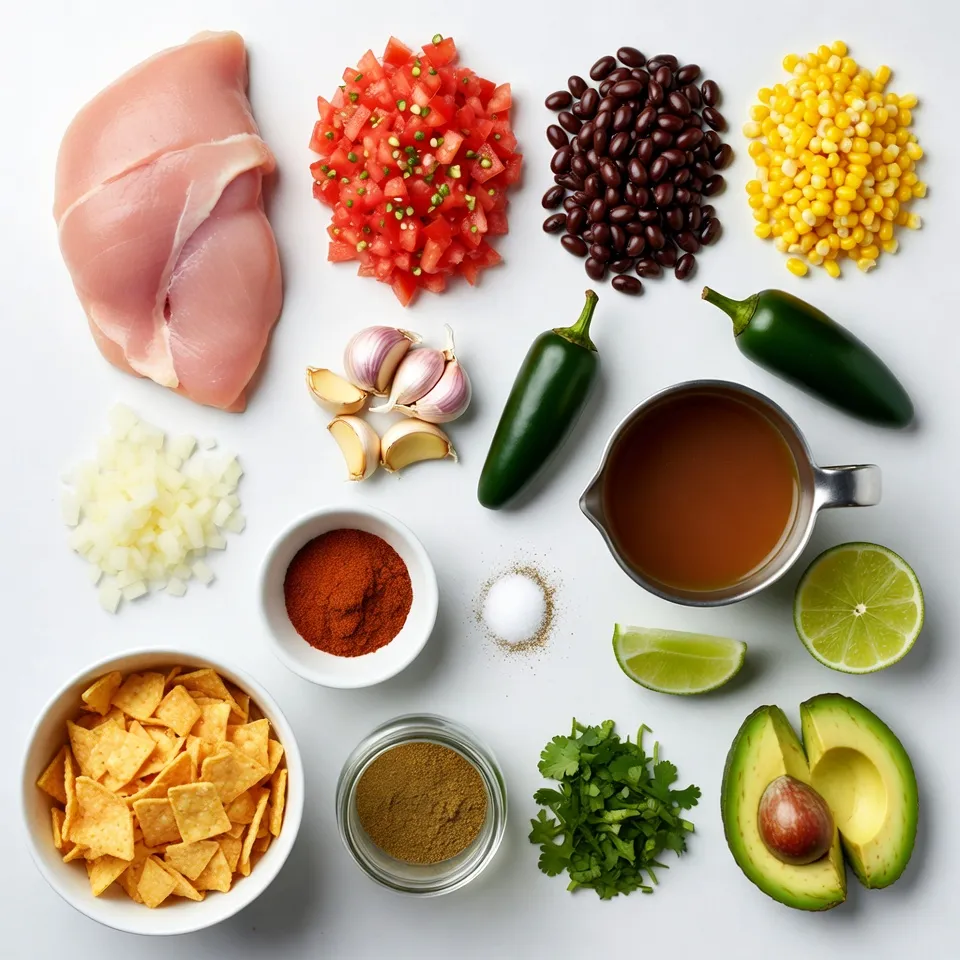 Gather these ingredients for a tasty soup. The chicken provides protein, while the veggies add color and taste. The spices give it warmth and depth. Make sure to have your garnishes ready for a nice finish. Tortilla chips add crunch, cilantro adds freshness, and avocado brings creaminess. Use fresh ingredients to boost flavor and nutrition. This mix of items makes your soup not only delicious but also fun to eat!