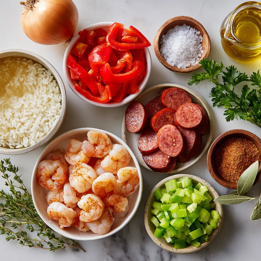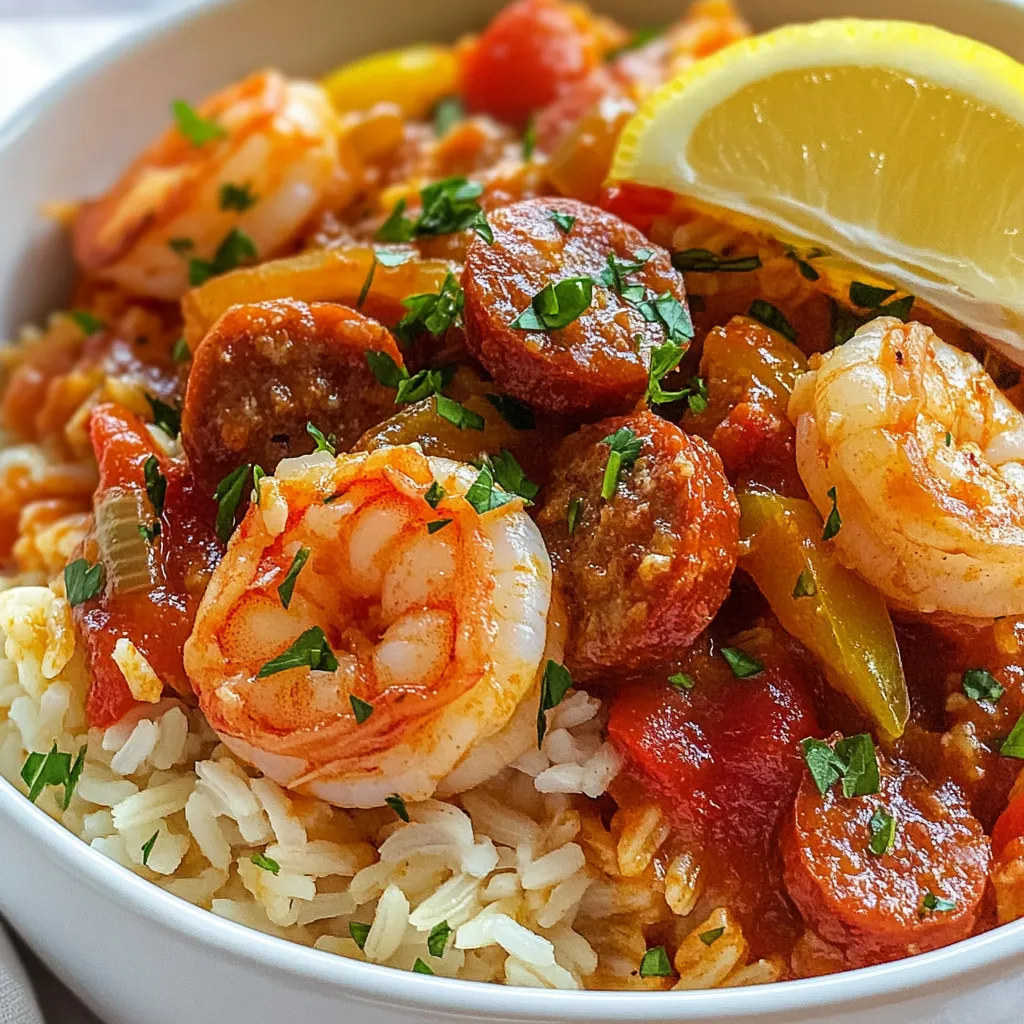 A flavorful and hearty jambalaya featuring shrimp and smoked sausage, perfect for a comforting meal.
