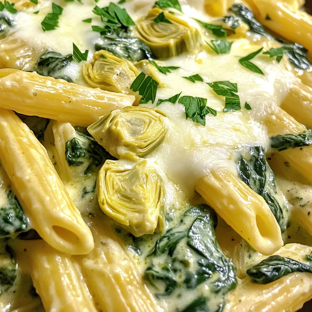 Let the pasta cook on low heat for 2-3 more minutes. This warms everything through and allows flavors to meld. Serve the creamy spinach artichoke pasta in bowls. You can garnish with fresh parsley for a lovely touch. Enjoy your meal!