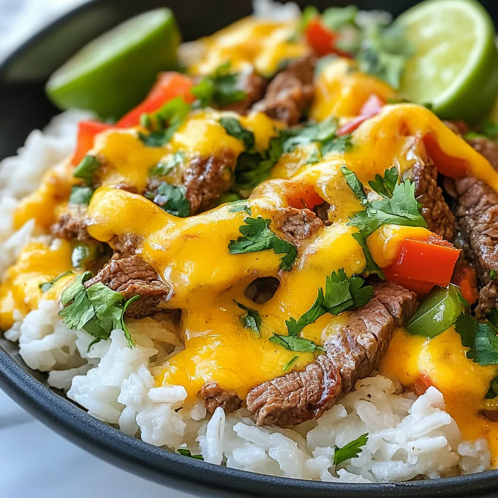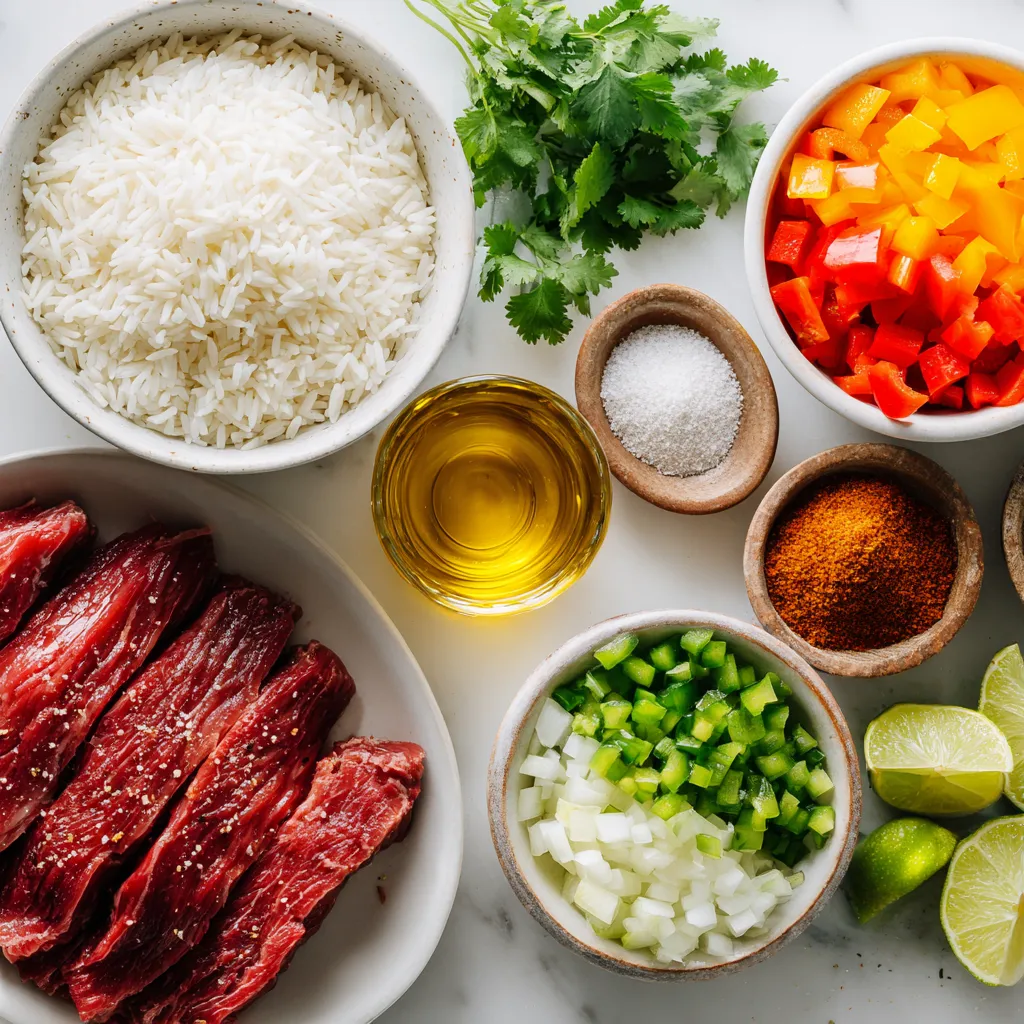 Each ingredient plays a key role in creating the dish’s rich flavor. The long-grain rice serves as a fluffy base. Beef broth adds savory depth. Olive oil helps sear the steak. The flank steak brings protein and bold taste. Spices like garlic powder, cumin, and smoked paprika enhance the dish’s warmth. Queso sauce makes it creamy and delicious. Bell peppers and onions contribute color and crunch. Fresh cilantro adds brightness, while lime wedges give a zesty finish to each bite.