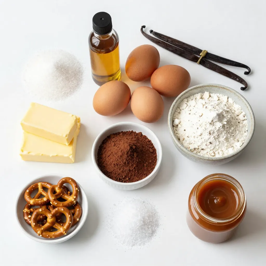 - 1 cup unsalted butter - 1 cup granulated sugar - 1 cup packed brown sugar - 4 large eggs - 1 teaspoon vanilla extract - 1 cup all-purpose flour - 1 cup cocoa powder - 1 teaspoon baking powder - 1/2 teaspoon salt - 1 cup crushed pretzels (plus extra for garnish) - 1 cup salted caramel sauce (store-bought or homemade) - Flaky sea salt (for topping) The first step in making these brownies is gathering your ingredients. You need unsalted butter for richness. The mix of granulated and brown sugar gives sweetness and depth. You will use four large eggs to bind everything together and add moisture. Vanilla extract brings out the flavors in your batter. For the dry mix, all-purpose flour and cocoa powder are key. Baking powder adds lift, while salt enhances taste. Crushed pretzels give a salty crunch that pairs well with sweetness. You can use store-bought salted caramel sauce or make your own for extra flair. Don't forget flaky sea salt to sprinkle on top for a savory finish. With these ingredients, you’ll create a treat that balances sweet and salty perfectly. Each bite is a delightful mix of flavors and textures. {{ingredient_image_2}} Start by preheating your oven to 350°F (175°C). Next, take a 9x13 inch baking pan. Grease it well or line it with parchment paper. This makes it super easy to remove the brownies later. In a large mixing bowl, melt 1 cup of unsalted butter. You can do this in the microwave or on the stovetop. Let the butter cool a bit, so it does not cook the eggs. Whisk in 1 cup of granulated sugar and 1 cup of packed brown sugar. Make sure the mixture is smooth. Then, add 4 large eggs one at a time. Mix well after each egg. Finally, stir in 1 teaspoon of vanilla extract until blended. In a separate bowl, sift together 1 cup of all-purpose flour, 1 cup of cocoa powder, 1 teaspoon of baking powder, and 1/2 teaspoon of salt. Gradually add this dry mix into the wet ingredients. Stir gently until just combined. Be careful! Overmixing can make brownies dense. Fold in 1 cup of crushed pretzels into the batter. Save a small handful for later. Pour half of the brownie batter into your prepared pan. Spread it evenly. Drizzle half of the salted caramel sauce over this layer. Pour the remaining brownie batter on top, covering the caramel. Drizzle the rest of the salted caramel sauce over this layer. Now, sprinkle the reserved crushed pretzels on top for a crunchy finish. Use a knife or toothpick to gently swirl the caramel into the brownie batter. Bake these brownies for 25-30 minutes. Check if they are ready by inserting a toothpick. It should come out with moist crumbs, not wet batter. Once baked, sprinkle flaky sea salt on top while they are still warm. Let them cool in the pan for at least 30 minutes. Now, cut them into squares and enjoy! To get soft and chewy brownies, follow these tips. Use unsalted butter for a rich flavor. Melt it gently; do not let it boil. Combine both sugars well with the butter for a smooth mix. Add eggs one at a time, mixing each in fully. Sift the dry ingredients to avoid lumps. Mix just until combined, as overmixing makes brownies dense. For a stunning look, drizzle caramel carefully. Pour half of the batter, then use half the caramel. Spread the second layer evenly, then drizzle again. Take a knife or toothpick and swirl gently. Don’t mix too much; you want swirls, not a blend. This keeps the caramel distinct in each bite. Here are some tools that make baking easier: - Mixing bowls - Measuring cups and spoons - Whisk for blending - Sifter for dry ingredients - Rubber spatula for folding - 9x13 inch baking pan - Parchment paper for easy removal - Knife or toothpick for marbling Serve these brownies on a rustic wooden board for charm. Drizzle extra salted caramel on top for more flavor. Add a sprinkle of crushed pretzels on the side for crunch. You can also pair them with vanilla ice cream for a treat. Enjoy them warm for the best experience! Pro Tips Use Room Temperature Ingredients: Allow your eggs and butter to come to room temperature before mixing. This helps to create a smoother batter and leads to better incorporation of ingredients. Don’t Overmix: Once you add the dry ingredients to the wet mixture, mix just until combined. Overmixing can lead to dense brownies rather than the desired fudgy texture. Check for Doneness: Instead of relying solely on baking time, check your brownies a few minutes before the recommended time. A toothpick should come out with a few moist crumbs for perfectly baked brownies. Store Properly: To keep your brownies fresh and fudgy, store them in an airtight container at room temperature. You can also freeze them for longer storage, just make sure to wrap them well. {{image_4}} You can make these brownies your own with fun add-ins. Try adding nuts like walnuts or pecans for crunch. Mini chocolate chips can add extra sweetness. Want a kick? A touch of espresso powder can enhance the chocolate flavor. If you love peanut butter, swirl it in with the caramel for a rich taste. To make these brownies gluten-free, use a gluten-free flour blend. Many brands work well in baking. For a dairy-free version, replace the butter with coconut oil or a vegan butter. Use a dairy-free caramel sauce to keep the flavor intact. These swaps help everyone enjoy this treat. Get creative with your toppings! Instead of just flaky sea salt, try crushed pretzels mixed with toffee bits. Drizzle melted chocolate over the top for a sweet touch. You could even add a scoop of ice cream on top when serving. Each option brings a new layer of flavor and fun. To keep your salted caramel pretzel brownies fresh, store them in an airtight container. This helps prevent them from drying out. Place a piece of parchment paper between layers if stacking. Store them at room temperature for up to four days. If you want to keep them longer, refrigeration is an option. Just remember, cold brownies can become a bit firmer. Freezing brownies is simple and effective. 