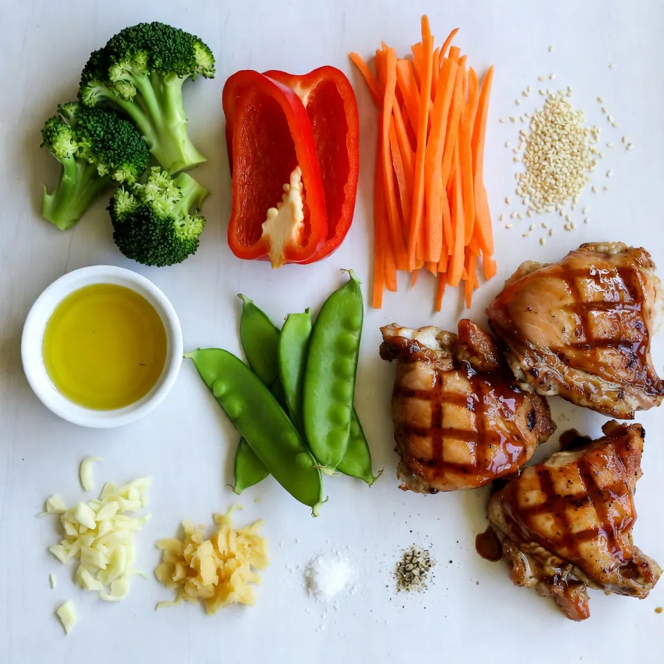 For this dish, I use boneless, skinless chicken thighs. They stay juicy and tender. Next, I add colorful veggies to brighten the meal. Broccoli florets give a nice crunch. Red bell pepper adds sweetness. Julienned carrots offer a pretty pop of color. Snap peas bring a fresh taste. Together, they make a great mix.