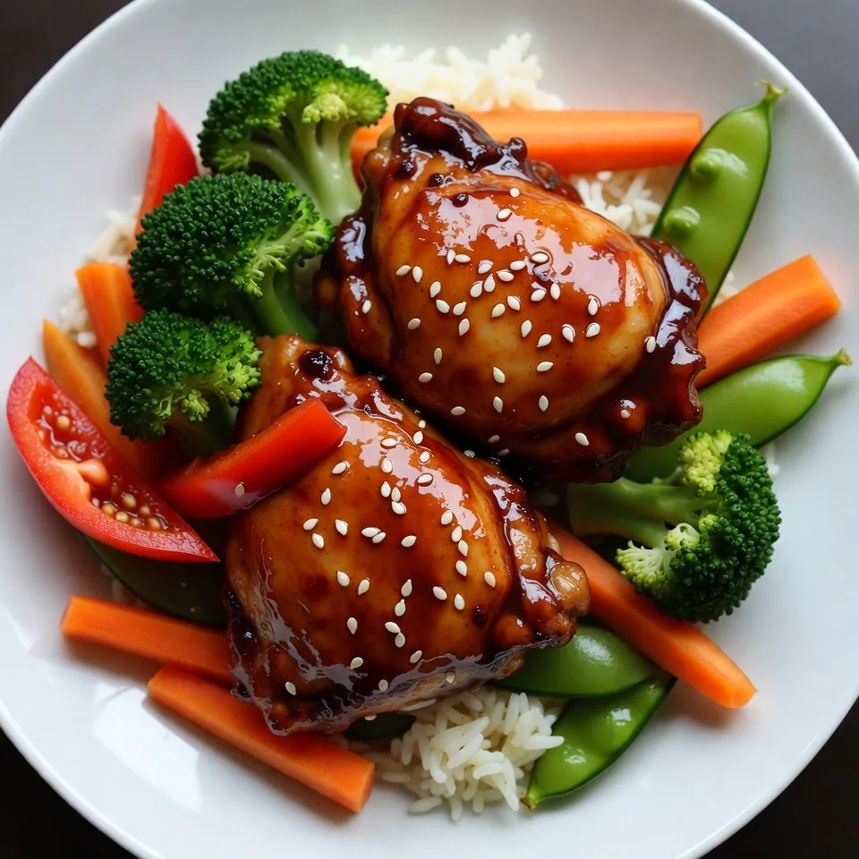 Serve your delicious teriyaki chicken and veggies over a generous scoop of cooked rice or quinoa, creating a hearty and satisfying meal.