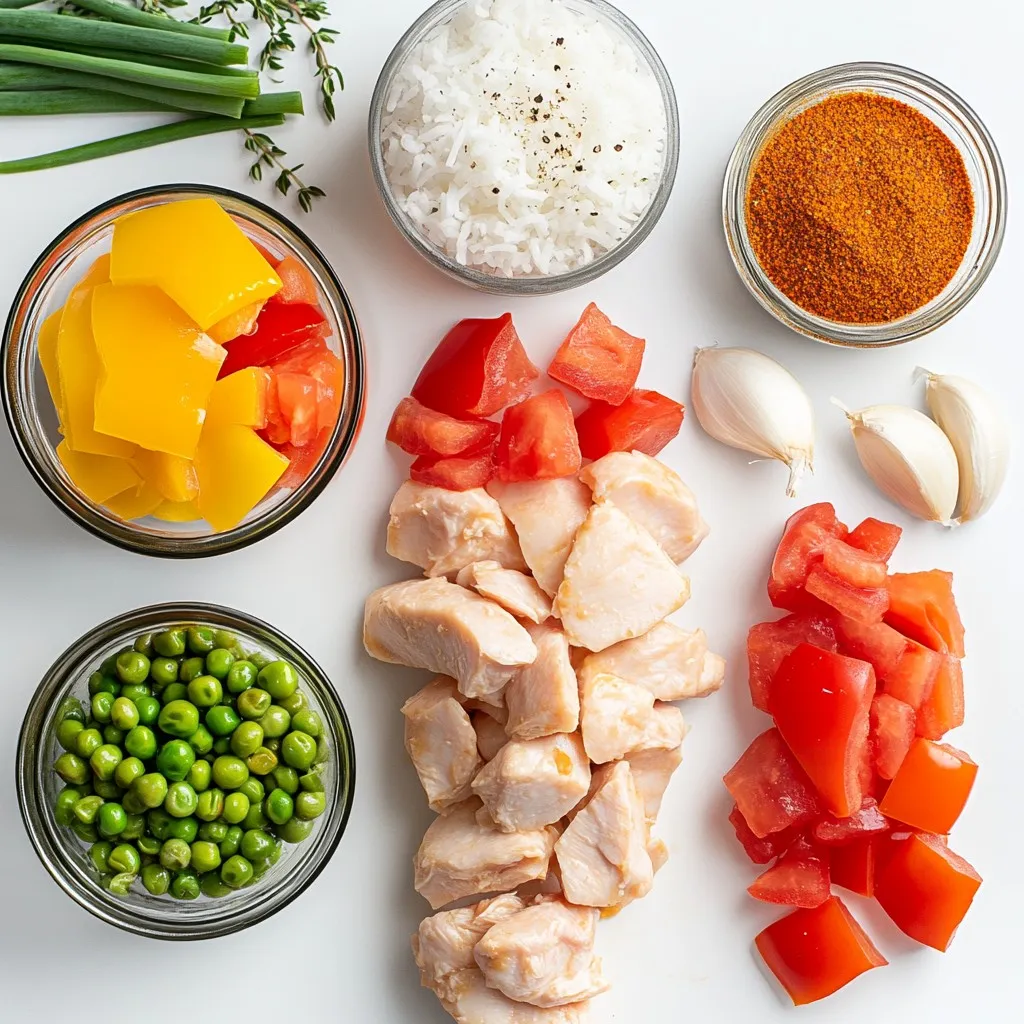 These ingredients form the base of the dish. The chicken gives a hearty protein, while the rice absorbs all the flavors. The diced tomatoes add moisture, and the bell pepper and onion bring color and crunch.