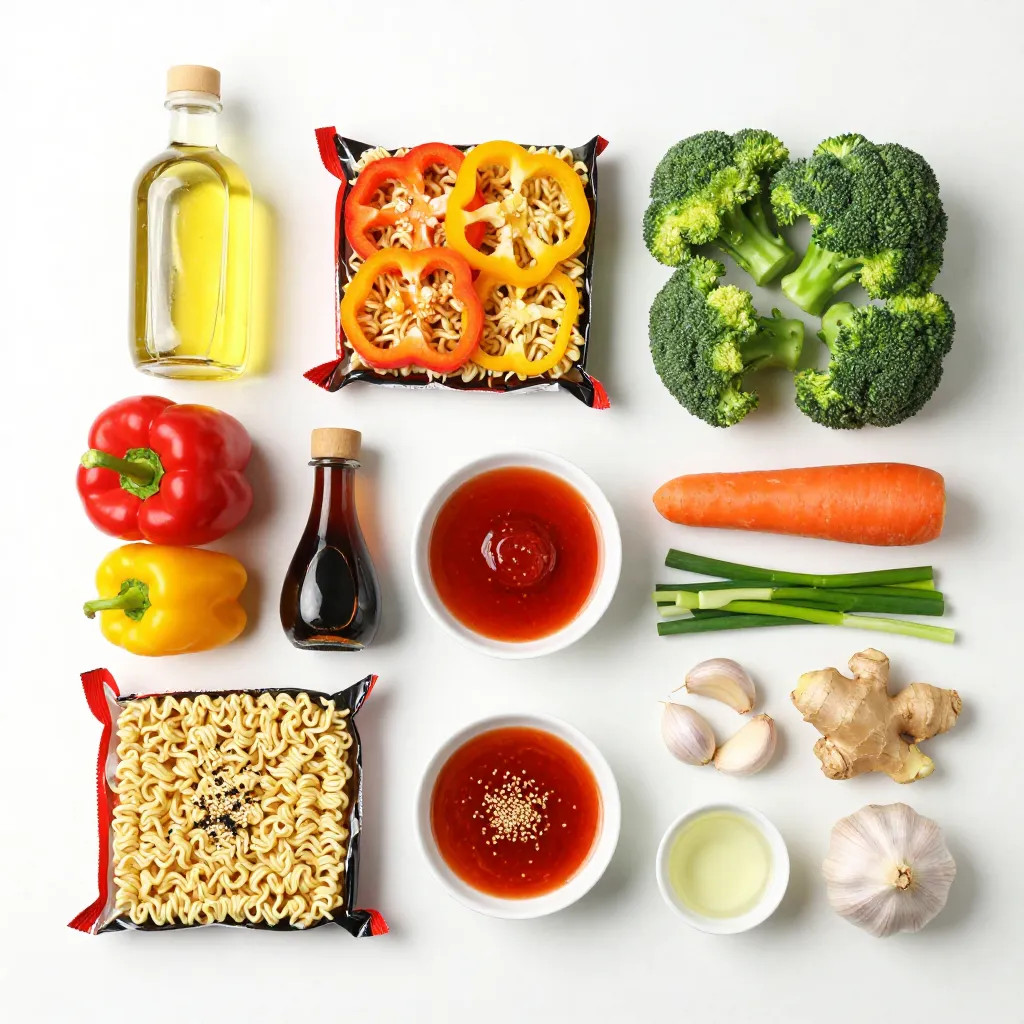 A vibrant and spicy stir fry featuring ramen noodles and fresh vegetables, perfect for a quick meal.