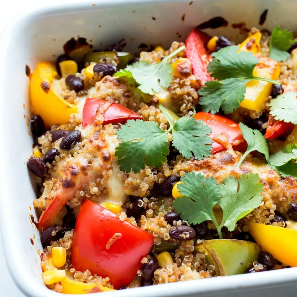 A colorful and hearty casserole featuring quinoa, black beans, and bell peppers, topped with melted cheese.