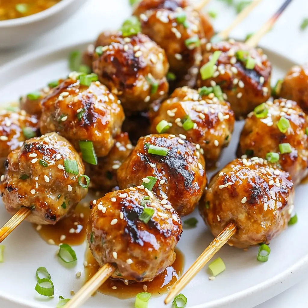 To make teriyaki meatball skewers, gather these simple ingredients: - 1 pound ground chicken - 1/2 cup breadcrumbs - 1/4 cup grated Parmesan cheese - 1/4 cup green onions, finely chopped - 2 cloves garlic, minced - 1 teaspoon fresh ginger, grated - 1 tablespoon soy sauce - 1/4 teaspoon black pepper - 1/4 teaspoon sesame oil - 1/2 cup teriyaki sauce (store-bought or homemade) - Optional: sesame seeds and sliced green onions for garnish If you can't find ground chicken, you can use ground turkey or pork. These options work well and keep the dish tasty. For breadcrumbs, try crushed crackers or gluten-free breadcrumbs. If you want a different flavor, add diced bell peppers or carrots into the meatball mix. For a lighter sauce, use a low-sodium or homemade teriyaki sauce. - Ground Chicken: This is the main ingredient. It keeps the meatballs tender and juicy. - Breadcrumbs: They help bind the meat together and add texture. - Parmesan Cheese: This adds a savory flavor and a bit of richness. - Green Onions: These give fresh, bright flavor and color. - Garlic and Ginger: Both add depth and a warm kick to the meatballs. - Soy Sauce: This brings umami and enhances the overall taste. - Teriyaki Sauce: This sweet and savory sauce coats the meatballs and adds a beautiful glaze. Each ingredient plays a key role in creating delicious teriyaki meatball skewers. {{ingredient_image_2}} For these tasty meatballs, mix your ingredients well. Start with a large bowl. Combine 1 pound of ground chicken with 1/2 cup of breadcrumbs. Add 1/4 cup of grated Parmesan cheese and 1/4 cup of finely chopped green onions. Next, mix in 2 minced garlic cloves and 1 teaspoon of grated fresh ginger. Then, pour in 1 tablespoon of soy sauce, along with 1/4 teaspoon of black pepper and 1/4 teaspoon of sesame oil. Use your hands or a spoon to mix everything until it’s evenly combined. This step is key for flavor. Now, let’s form the meatballs. Lightly oil your hands to keep the mixture from sticking. Shape the mixture into about 16 meatballs, each roughly 1 inch in diameter. This size helps them cook evenly. If you use wooden skewers, soak them in water for 30 minutes. This step prevents burning. Thread the meatballs onto the skewers, making sure to space them out evenly. This allows for even cooking and nice grill marks. Preheat your grill or grill pan to medium heat. This preheating is important to cook the meatballs well. Place the skewers on the grill and cook for 10 to 12 minutes. Turn them often to cook all sides nicely. In the last minute, brush the meatballs with the remaining 1/2 cup of teriyaki sauce. This adds a great glaze and flavor. When done, let the skewers rest for a few minutes. This step keeps the meatballs juicy. Finally, garnish with sesame seeds and extra green onions if you like. Enjoy your delicious Teriyaki Meatball Skewers! To make tasty meatballs, use fresh ingredients. I love adding grated ginger and garlic for a punch of flavor. The breadcrumbs help keep the meatballs tender. For a cheesy touch, add Parmesan cheese. You can also mix in finely chopped green onions for freshness. - Use 1 pound ground chicken for a light yet flavorful base. - Mix in 1/2 cup breadcrumbs to bind everything together. - Add 1/4 cup grated Parmesan cheese for creaminess. - Incorporate 1/4 cup finely chopped green onions for extra taste. - Don't forget 2 cloves minced garlic and 1 teaspoon grated ginger for zest. To get those beautiful grill marks, preheat your grill to medium heat. This way, the meatballs sear quickly. When placing the skewers on the grill, make sure they have space between them. That allows heat to circulate evenly. Turn the skewers every few minutes for even cooking. - Preheat the grill to medium heat for best results. - Space the skewers apart to allow proper air flow. - Turn the meatballs often to develop even marks. A few simple mistakes can ruin your meatballs. First, don’t overcrowd the grill. This can cause uneven cooking. Also, avoid flipping them too early. You want a nice crust before turning. Lastly, brushing the sauce too soon can lead to burning. Save some for the last minute! - Avoid overcrowding the grill; give each skewer space. - Wait until a crust forms before flipping to avoid breaking. - Brush extra sauce in the last minute to prevent burning. Pro Tips Use Fresh Ingredients: Opt for fresh ground chicken, as it provides better flavor and texture compared to frozen varieties. Perfect Meatball Size: Keep your meatballs uniform in size to ensure even cooking and consistent grilling results. Marinate for Extra Flavor: If time allows, marinate the meatball mixture in the refrigerator for 30 minutes to an hour for enhanced flavor. Rest Before Serving: Allow skewers to rest for a few minutes after grilling to lock in juices and enhance tenderness. {{image_4}} You can swap ground chicken for other meats. Ground turkey works well too. If you prefer beef, use ground beef. For a unique twist, try ground pork. Each meat brings its own flavor. You can even use plant-based meat for a veggie option. This way, everyone can enjoy the skewers. Teriyaki sauce is a classic choice, but you can get creative. Try a sweet and spicy glaze with honey and sriracha. A soy sauce and garlic mix can add depth. For a tangy twist, use a mix of orange juice and soy sauce. Marinades change the taste of your meatballs, so feel free to experiment! Serve your skewers with rice or quinoa for a hearty meal. Steamed broccoli or green beans add color and crunch. A fresh salad with sesame dressing pairs nicely too. You can also serve them in lettuce wraps for a fun, low-carb option. Enjoy your Teriyaki Meatball Skewers with these tasty sides! After enjoying your teriyaki meatball skewers, you may have some leftovers. To store them, let the skewers cool down first. Place them in an airtight container. This helps keep the meatballs fresh. You can keep them in the fridge for up to three days. If you want to keep them longer, free