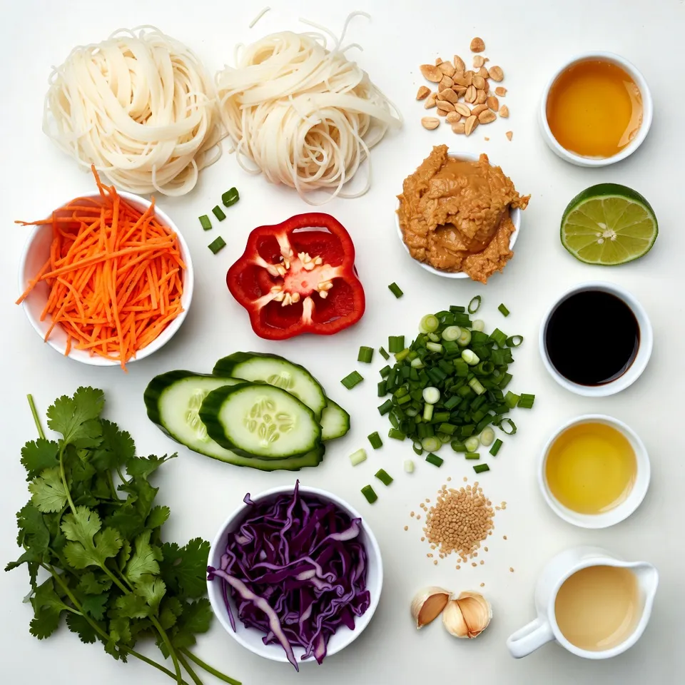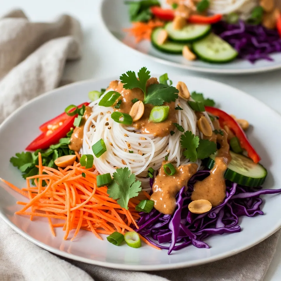 - 8 oz rice noodles - 1 cup shredded carrots - 1 red bell pepper, thinly sliced - 1 cucumber, julienned - 1 cup red cabbage, shredded - 1/2 cup green onions, chopped - 1/4 cup fresh cilantro, chopped - 1/4 cup roasted peanuts, chopped This salad is bright and full of crunch. The rice noodles are the base. They soak up all the flavors. Carrots add a sweet crunch. The red bell pepper brings color and taste. Cucumber adds a refreshing bite. Red cabbage gives a lovely crunch and color. Green onions add a mild onion flavor. Finally, cilantro ties everything together with its fresh taste. - 1/3 cup peanut butter - 2 tablespoons soy sauce - 1 tablespoon lime juice - 1 tablespoon honey or maple syrup - 1 teaspoon sesame oil - 1 garlic clove, minced - 1/4 cup warm water (to thin the sauce) The peanut sauce is creamy and rich. Peanut butter is the star here. Soy sauce adds salty depth. Lime juice gives it a tangy kick. Honey or maple syrup adds sweetness. Sesame oil adds a nutty aroma. Garlic gives it a punch of flavor. Mixing in warm water helps make it smooth. - Extra chopped cilantro - Lime wedges - Additional roasted peanuts Garnishes add extra flair. More cilantro boosts the fresh taste. Lime wedges give a citrusy burst when squeezed. Extra peanuts add crunch. Use these to make your dish even better. {{ingredient_image_2}} First, boil 8 ounces of rice noodles. Follow the package directions. Once done, drain the noodles. Rinse them under cool water. This stops the cooking process. Set the noodles aside for later. Take a large bowl. Add 1 cup of shredded carrots. Then, slice 1 red bell pepper thinly and add it. Next, julienne 1 cucumber and toss it in. Add 1 cup of shredded red cabbage. Chop 1/2 cup of green onions and mix them in. Finally, add 1/4 cup of chopped fresh cilantro for a burst of flavor. Grab a separate bowl for the peanut sauce. Mix together 1/3 cup of peanut butter and 2 tablespoons of soy sauce. Squeeze in 1 tablespoon of lime juice. Add 1 tablespoon of honey or maple syrup for sweetness. Pour in 1 teaspoon of sesame oil. Mince 1 garlic clove and add that too. Whisk in 1/4 cup of warm water to thin it out. Adjust with more water if needed. Combine the cooled rice noodles with the vegetable mix. Pour the peanut sauce over everything. Gently toss all the ingredients. Make sure the noodles and veggies are coated well with the sauce. Serve the salad in a large bowl. Sprinkle 1/4 cup of chopped roasted peanuts on top for crunch. Add extra cilantro if you like. For a nice touch, a splash of lime juice brightens it up. Enjoy it right away or chill it for 30 minutes. This helps the flavors blend. To cook rice noodles, follow the package instructions closely. First, bring a pot of water to a boil. Add the rice noodles and cook them for about 5-7 minutes. They should be soft but still firm to the bite. After cooking, drain them in a colander. Rinse the noodles with cold water to stop the cooking. This step helps keep them from sticking together. Set them aside until you mix them with the salad. Start with smooth peanut butter for the best sauce. Combine peanut butter, soy sauce, lime juice, honey, sesame oil, minced garlic, and warm water in a bowl. Whisk all ingredients together until the sauce is creamy. If it’s too thick, add more warm water, a tablespoon at a time. Taste the sauce and adjust flavors to your liking. You can add more lime juice for tang or more honey for sweetness. You can make this salad your own by adding more crunch or flavor. Consider adding chopped bell peppers for extra color. Fresh herbs like mint or basil can add a nice touch too. If you like spice, sliced chili peppers or a dash of sriracha can kick up the heat. Finally, toasted sesame seeds or crushed peanuts on top give a great crunch. These additions make the dish even more enjoyable! Pro Tips Use Fresh Ingredients: Fresh vegetables and herbs will enhance the flavor and texture of your salad, making it more vibrant and delicious. Adjust Sauce Thickness: If the peanut sauce is too thick, gradually add more warm water until you reach your desired consistency for easier mixing with the noodles. Chill for Flavor: Letting the salad sit in the refrigerator for 30 minutes allows the flavors to meld together beautifully, enhancing the overall taste. Crunch Factor: For added crunch, consider topping your salad with crispy fried shallots or additional roasted peanuts right before serving. {{image_4}} To make a vegan version of the Thai peanut noodle salad, swap honey for maple syrup. This small change keeps the dish sweet while remaining plant-based. You can also check the labels on the peanut butter and soy sauce to ensure they are vegan-friendly. The rest of the ingredients work great as they are. For a gluten-free dish, use gluten-free soy sauce or tamari instead of regular soy sauce. Rice noodles are already gluten-free, making them a perfect base. Always double-check your sauces for gluten-containing ingredients to stay safe. If you want to add protein, consider cooked tofu or chickpeas. Both options mix well with the noodles and veggies. Grilled chicken or shrimp can also work if you prefer meat. Just cook them separately, then toss them in with the salad for a hearty meal. To keep your Thai peanut noodle salad fresh, place it in an airtight container. Make sure to seal it well. This salad stays good for about 3 days in the fridge. If you notice any extra moisture, drain it before sealing. When prepping for the week, store the salad ingredients separately. Keep the noodles, veggies, and peanut sauce in different containers. This helps keep everything fresh and crunchy. Mix them together right before eating. It saves time and keeps the flavors bright. You can eat the salad cold or at room temperature. If you want to warm it up, do so gently. Heat the noodles in a pan over low heat with a splash of water. Add fresh veggies afterward to keep them crisp. If the sauce thickens, mix in a little warm water to refresh