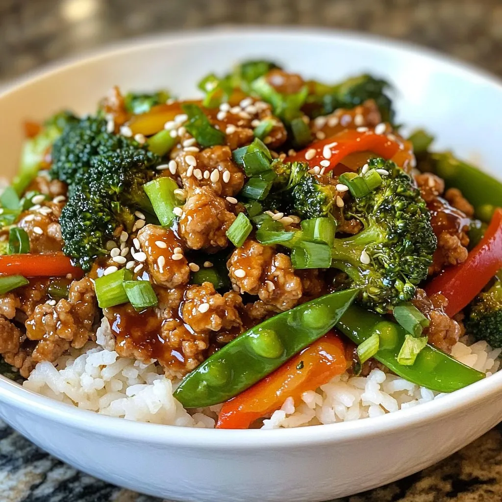 A vibrant and tasty stir-fry featuring ground turkey and fresh vegetables, coated in a savory teriyaki sauce.