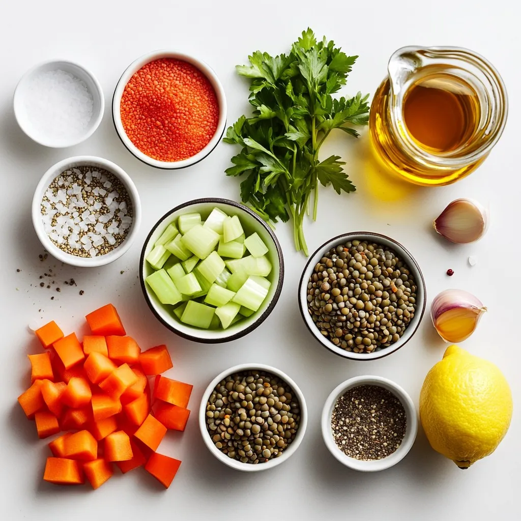 Lay out all your ingredients. You will need the lentils, diced vegetables, a can of diced tomatoes, vegetable broth, spices, olive oil, lemon juice, salt, black pepper, and fresh parsley for garnish.