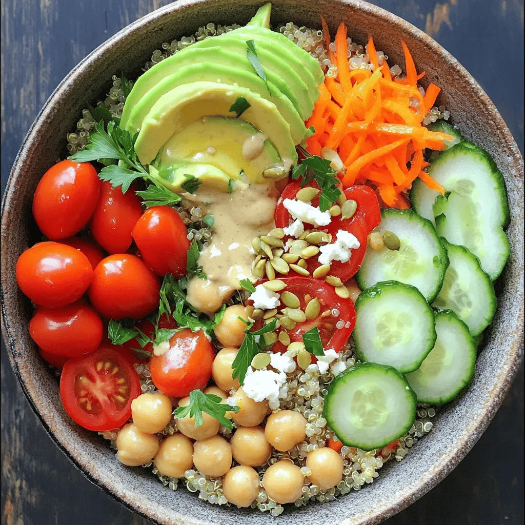 Quinoa is a great base for this dish. It is protein-rich and filling. I always rinse it well to remove any bitterness. For cooking, I use vegetable broth. It adds more flavor than water. The fresh vegetables bring colors and textures. Cherry tomatoes offer sweetness, while cucumber gives a nice crunch. Chickpeas add protein and fiber, making this meal more satisfying. Carrots add sweetness and a pop of color. And avocado? It provides creaminess that ties everything together.