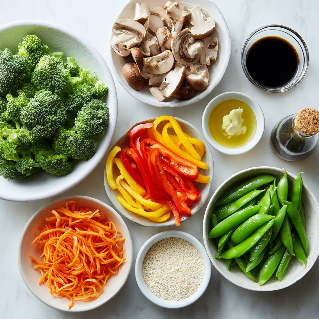 First, add the broccoli florets and julienned carrots. Stir-fry for 3-4 minutes until they are bright and tender. Next, add sliced bell peppers, sugar snap peas, and mushrooms. Stir-fry for 3-5 more minutes. This helps all veggies stay crisp and colorful.